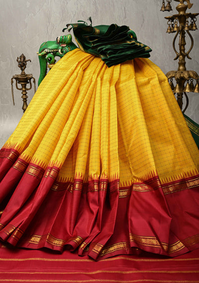 Korvai Yellow Kanjivaram Pure Silk Saree with Checks Pattern and Rettaipet Ganga Jamuna borders | SILK MARK CERTIFIED