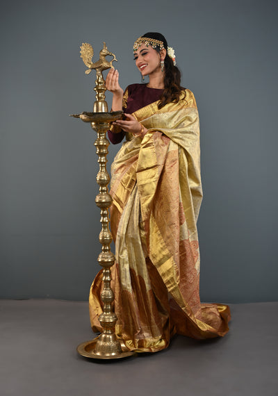 Golden Brocade Tissue Kanjivaram Pure Silk Saree With Zari Border | SILK MARK CERTIFIED