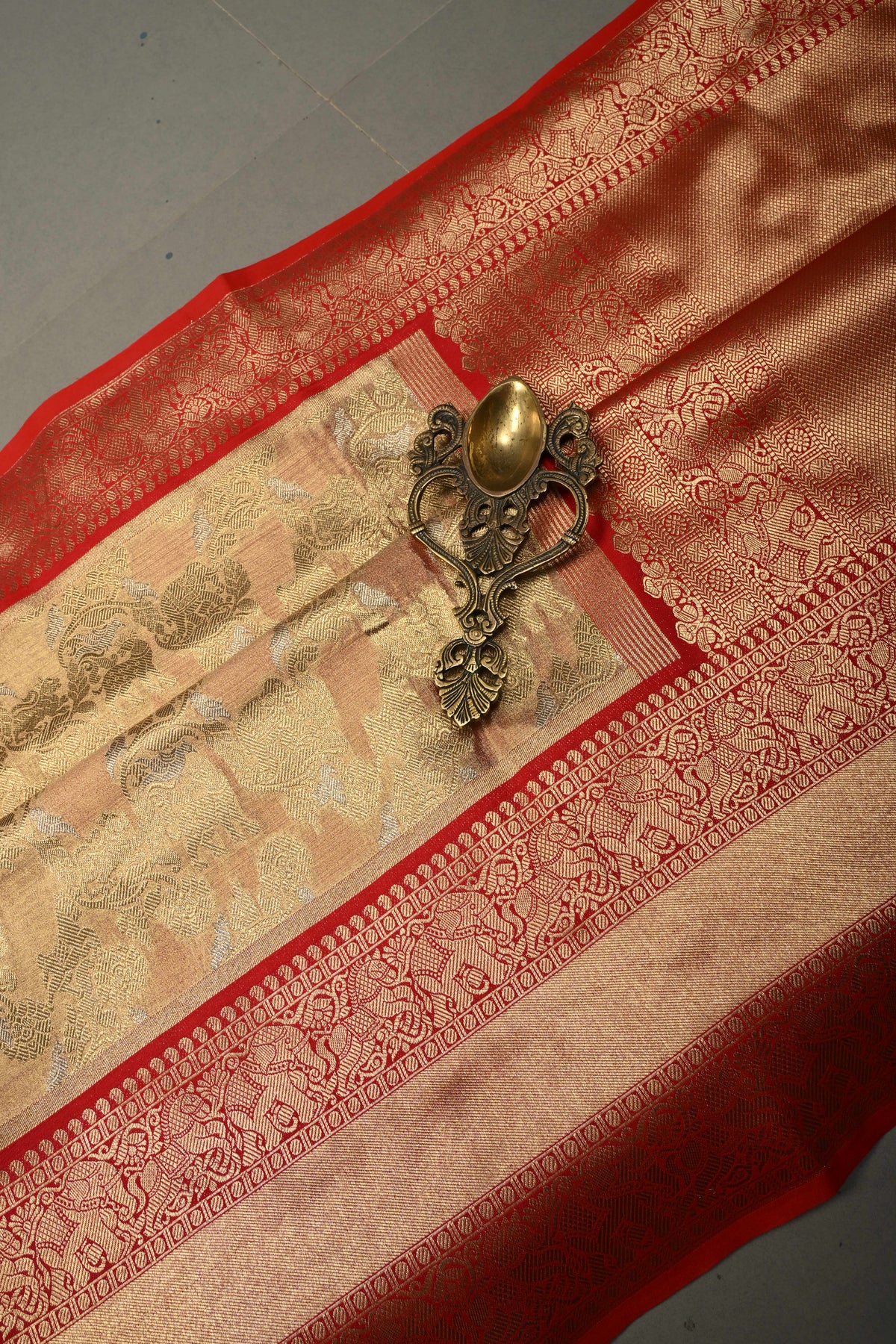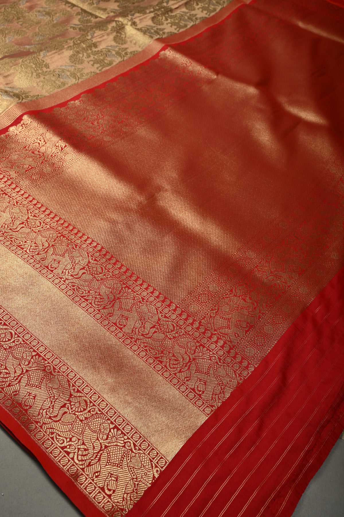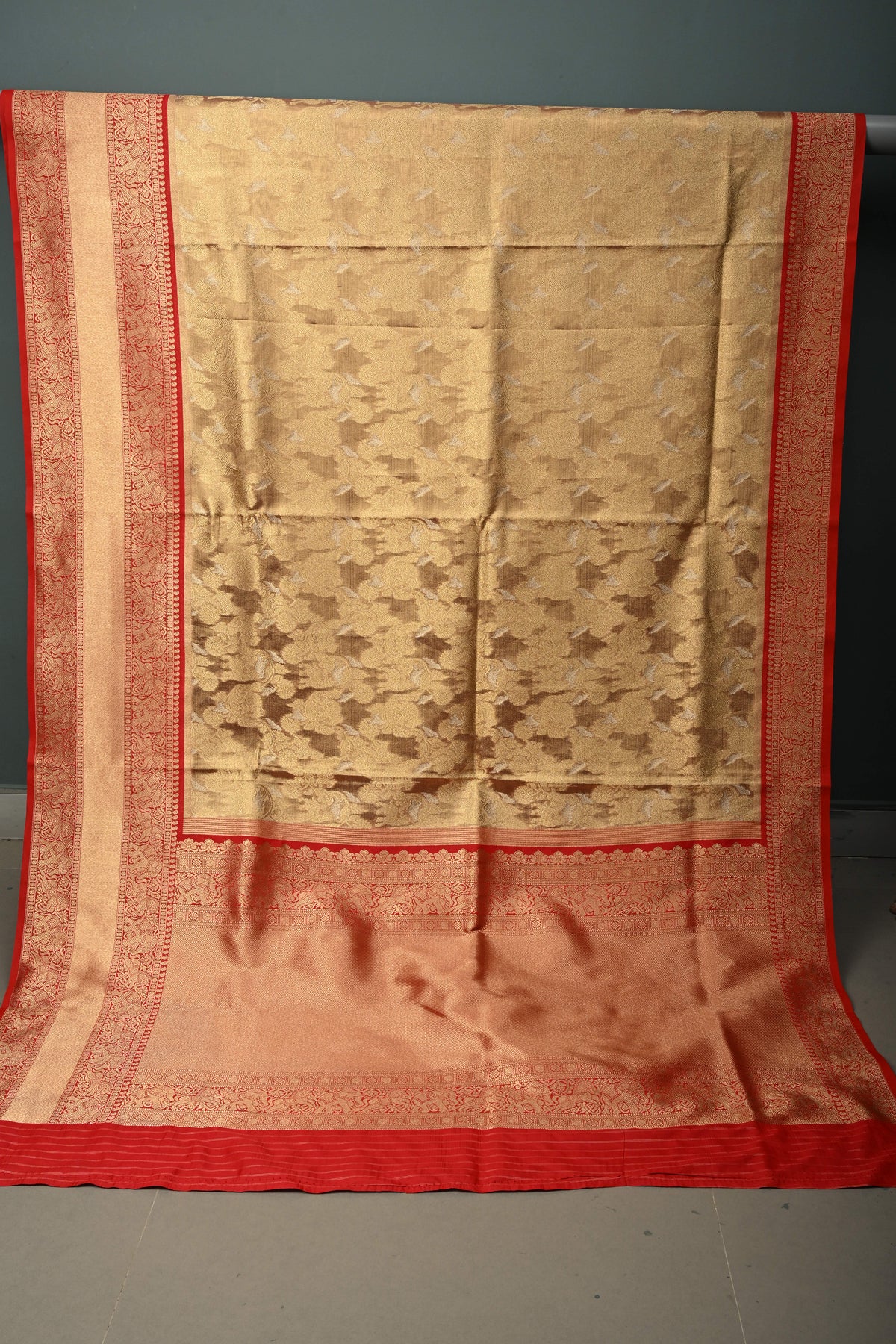 This Gold Banarasi Vegan Silk Tissue Kadiyal Weave Saree is a graceful expression of classic Banarasi artistry. Crafted in a gold tissue base, the saree offers a lightweight drape with a rich, festive sheen. The intricate Alfi Shikargah jaal woven across the body reflects royal-inspired motifs, adding depth and narrative charm. The traditional kadiyal weave enhances the saree’s structure and visual contrast, lending it a refined finish. A bold contrast stack zari border frames the saree beautifully, elevating its regal appeal. Perfect for weddings, festive occasions, and grand celebrations, this saree embodies timeless elegance and heritage craftsmanship.