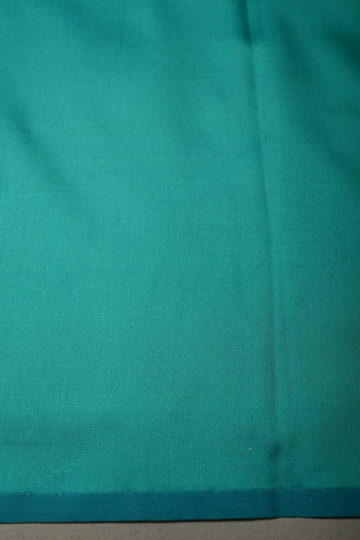 The body features a finely crafted Shikaargah Aada jaal, showcasing geometric elegance and intricate artistry. A striking contrast teal border enhances the overall design, adding contemporary flair to its timeless appeal. Perfect for weddings, festive celebrations, f