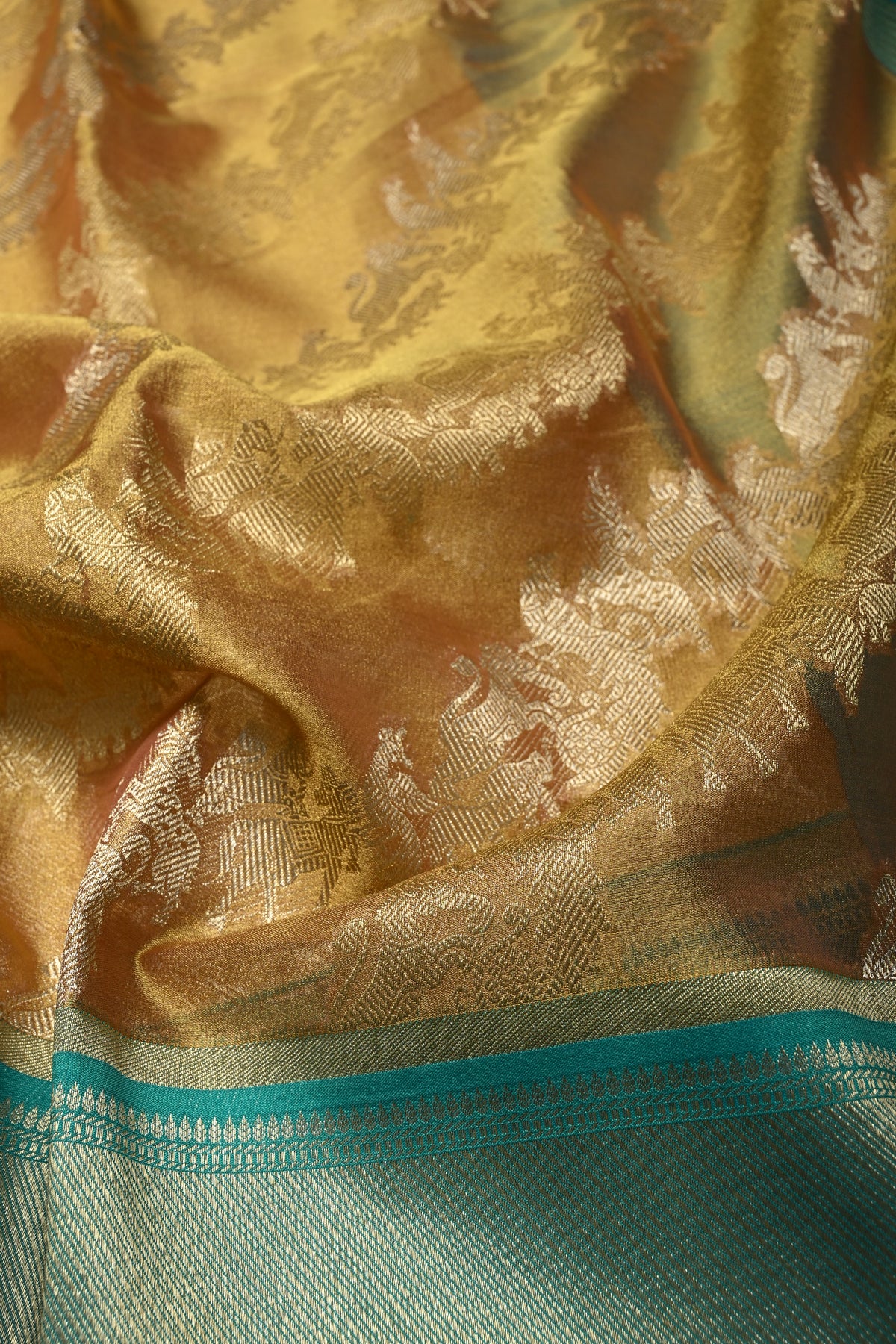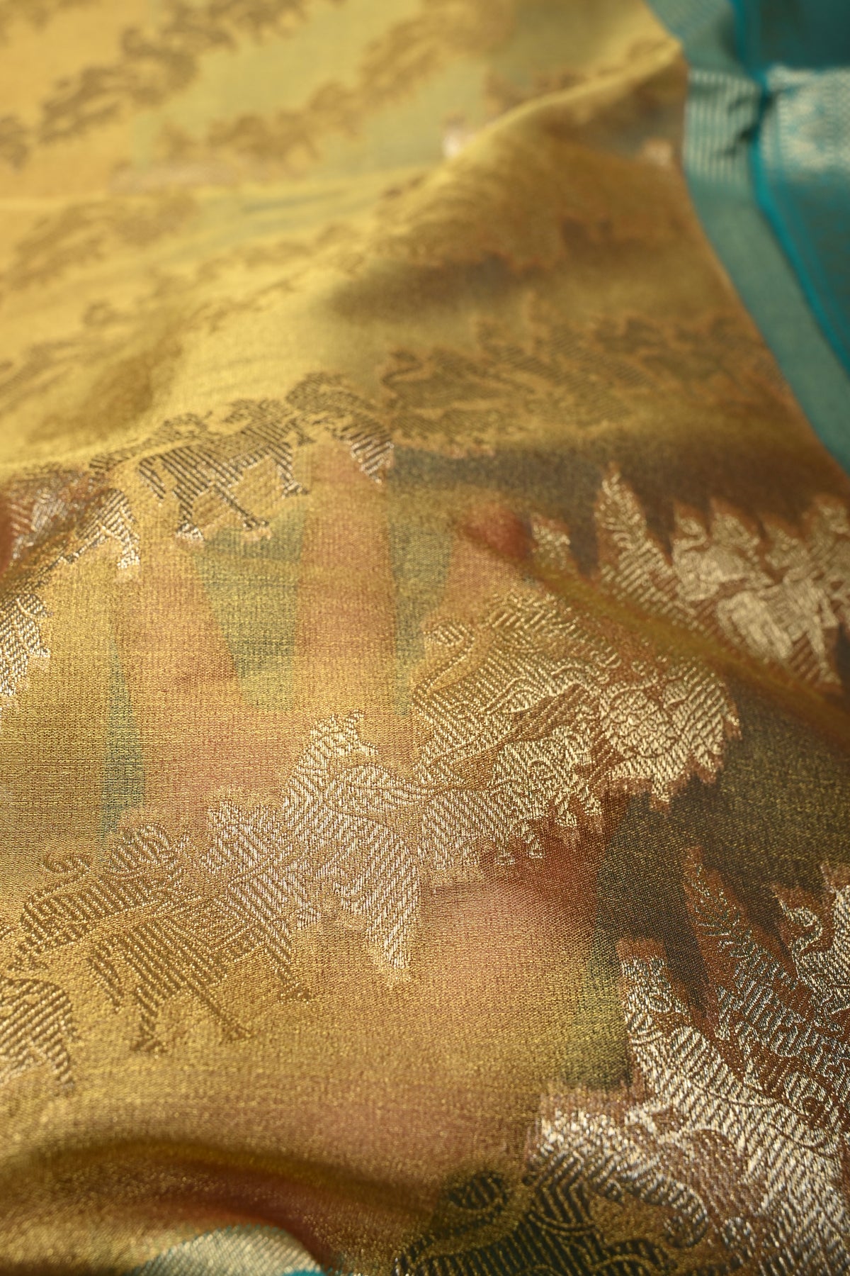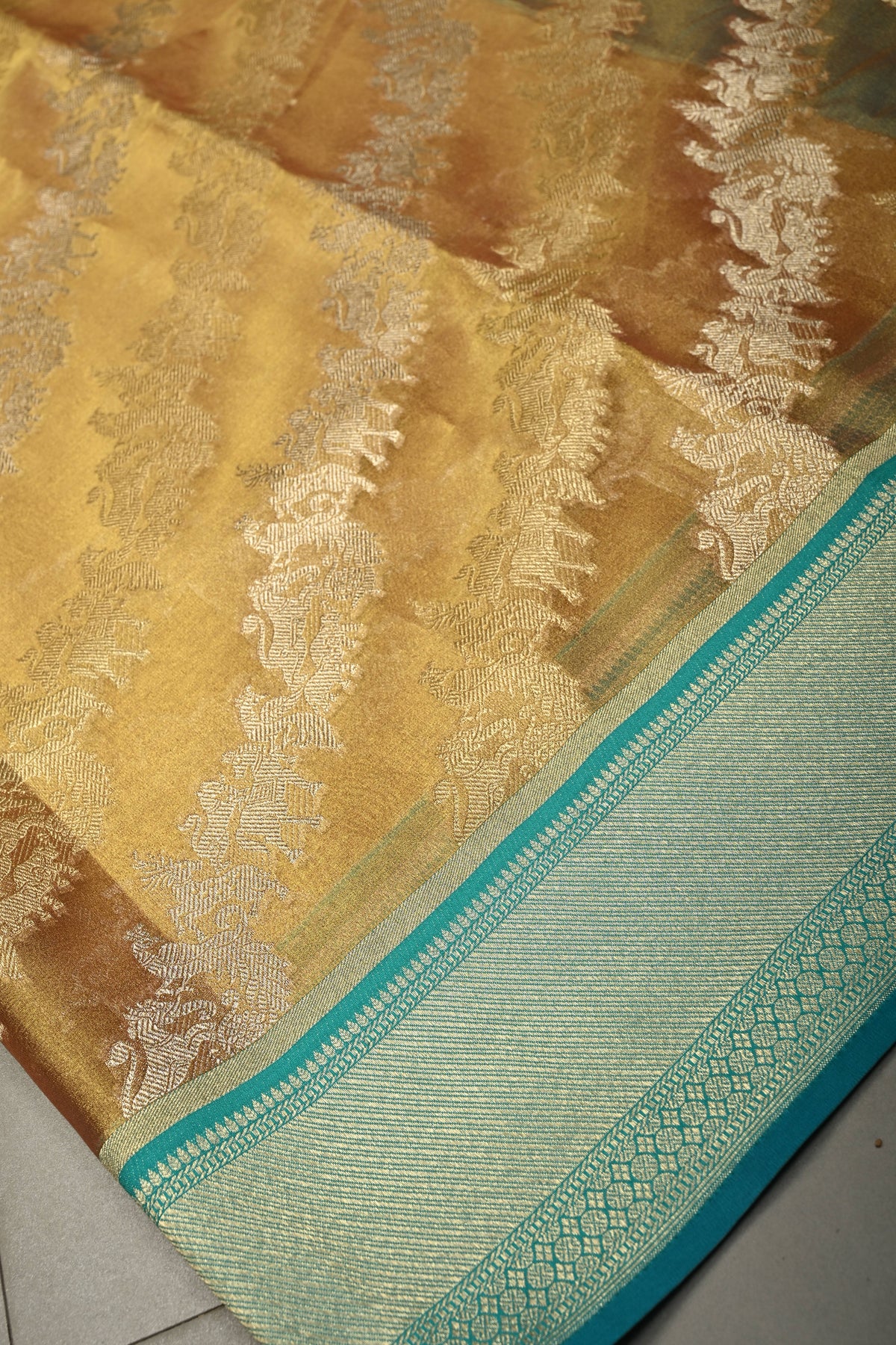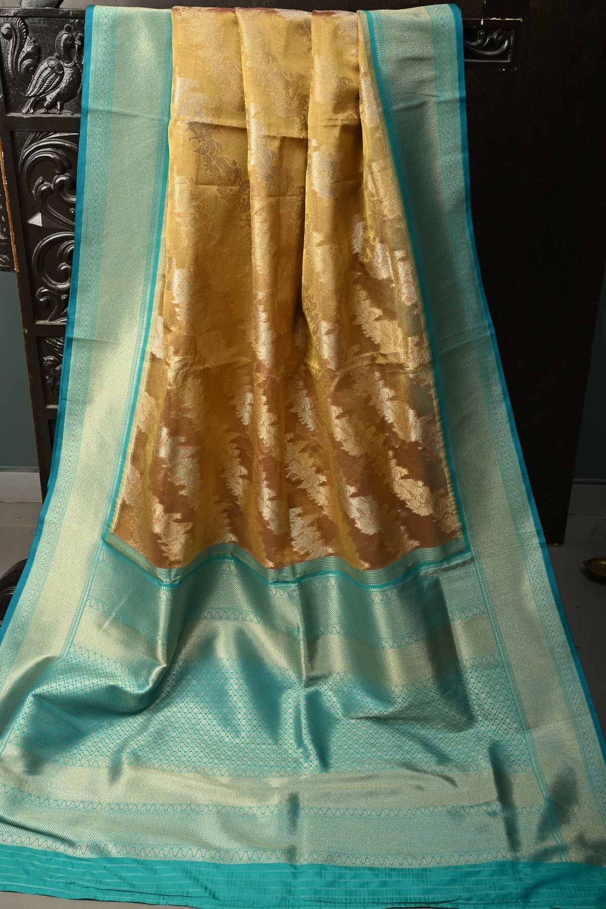 Radiant and, this Gold Banarasi Vegan Tissue Saree is a perfect blend of traditional Banarasi craftsmanship and modern eco-friendly design. Woven from vegan silk tissue, it offers a lightweight yet elegant drape with a soft, lustrous sheen, ideal for festive and ceremonial occasions.