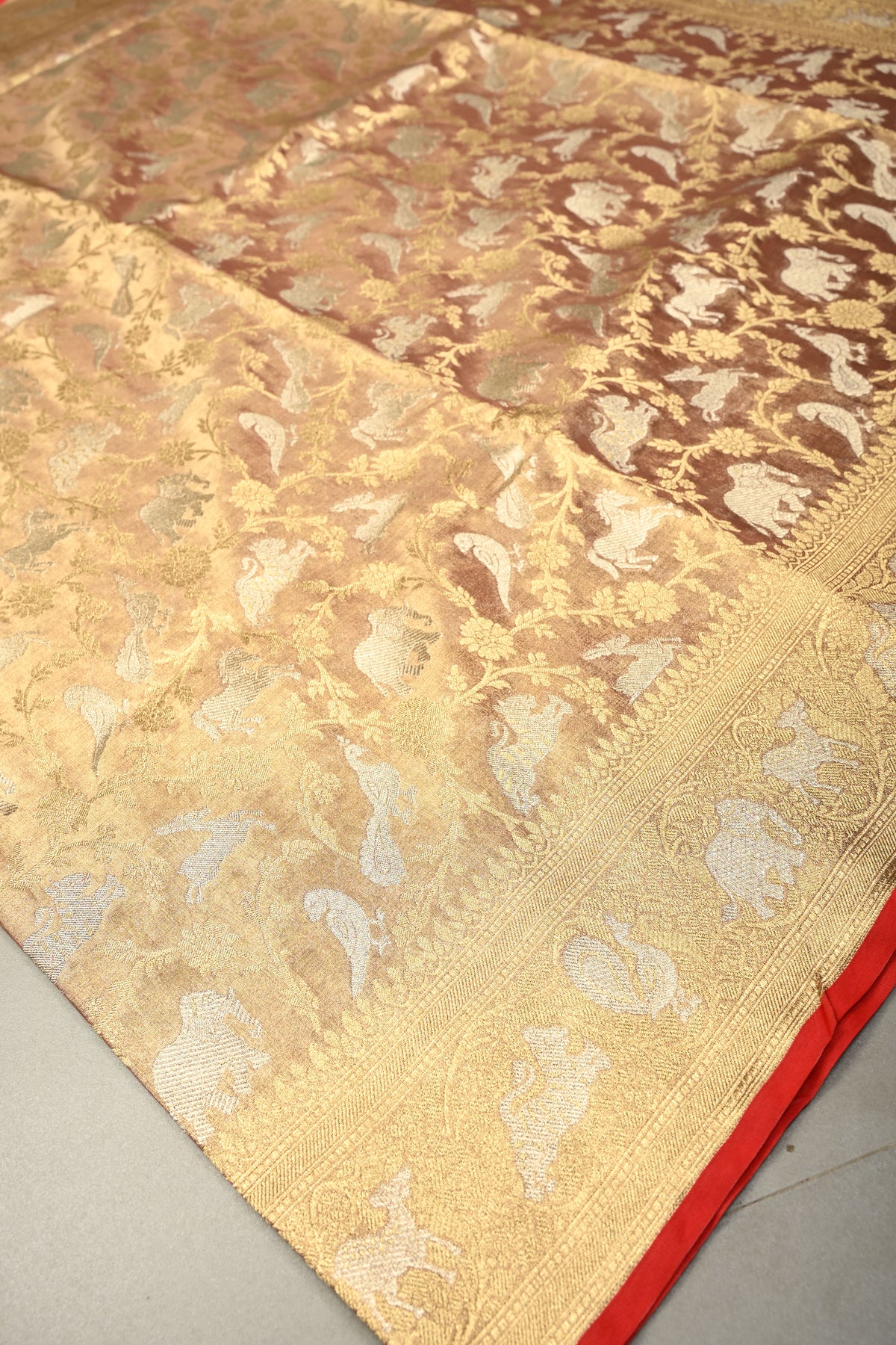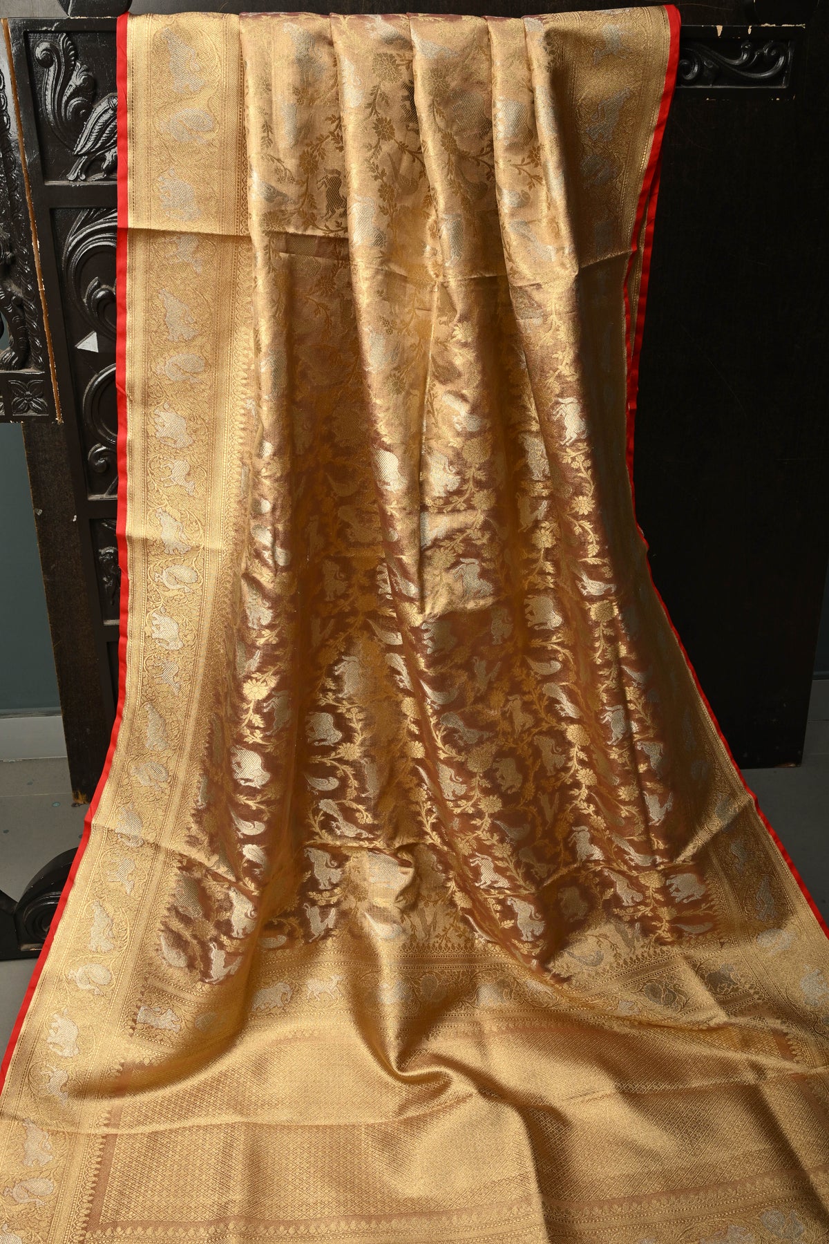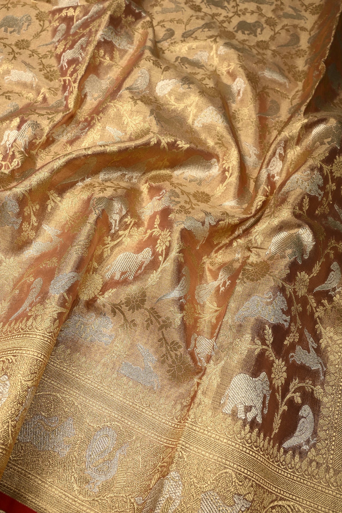 Experience regal elegance with this Light Chikoo Banarasi Vegan Silk Tissue Saree, adorned with an exquisite Alfi Shikargah jaal and a finely detailed border. Crafted from vegan silk tissue, the saree offers a lightweight drape with a subtle, luminous sheen. The intricate Shikargah jaal motifs lend a rich heritage appeal, while the Banarasi weaving and elegant border add timeless sophistication. Perfect for weddings, festive celebrations, or grand occasions, this saree beautifully blends traditional artistry with contemporary, sustainable luxury.