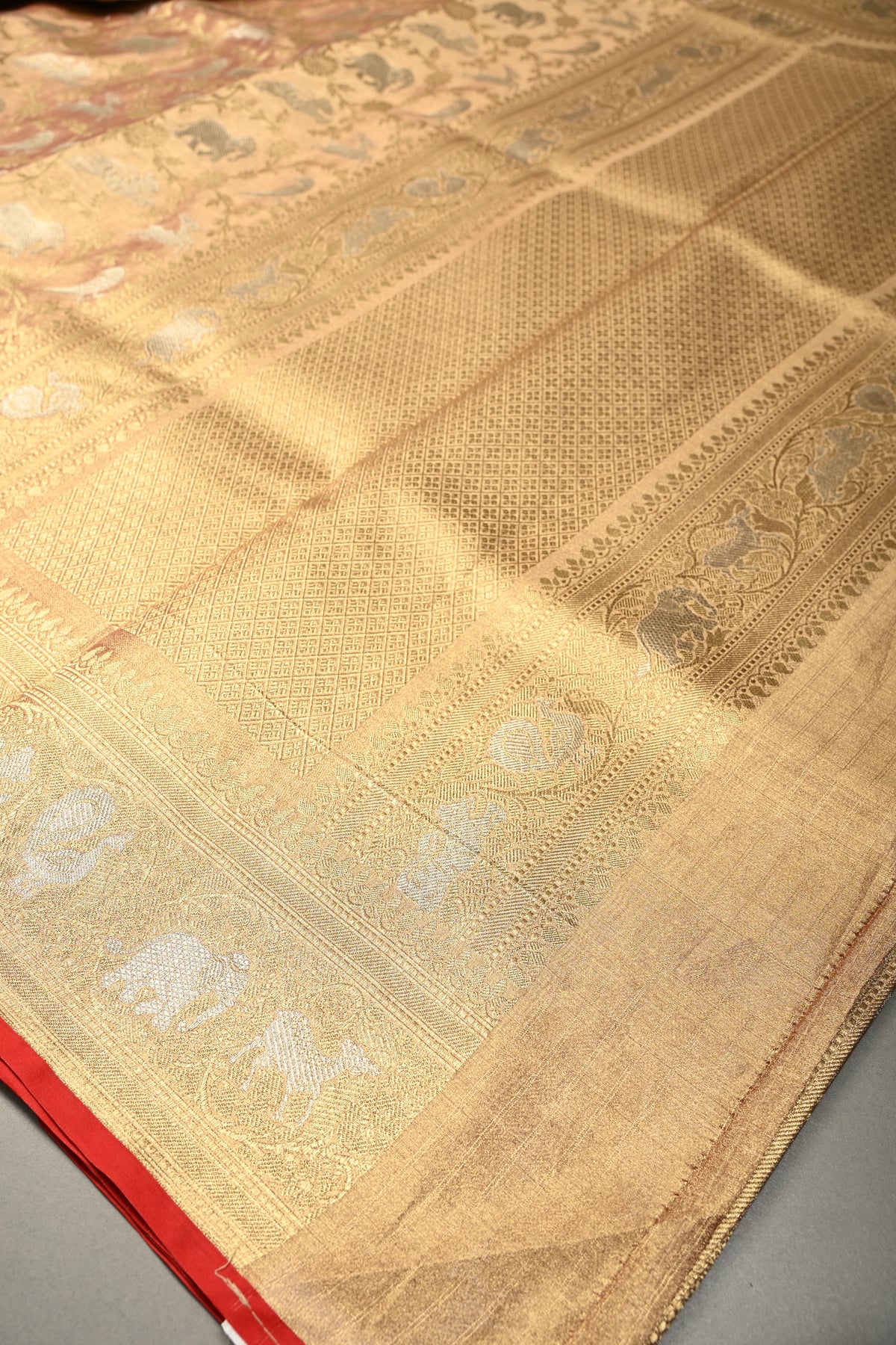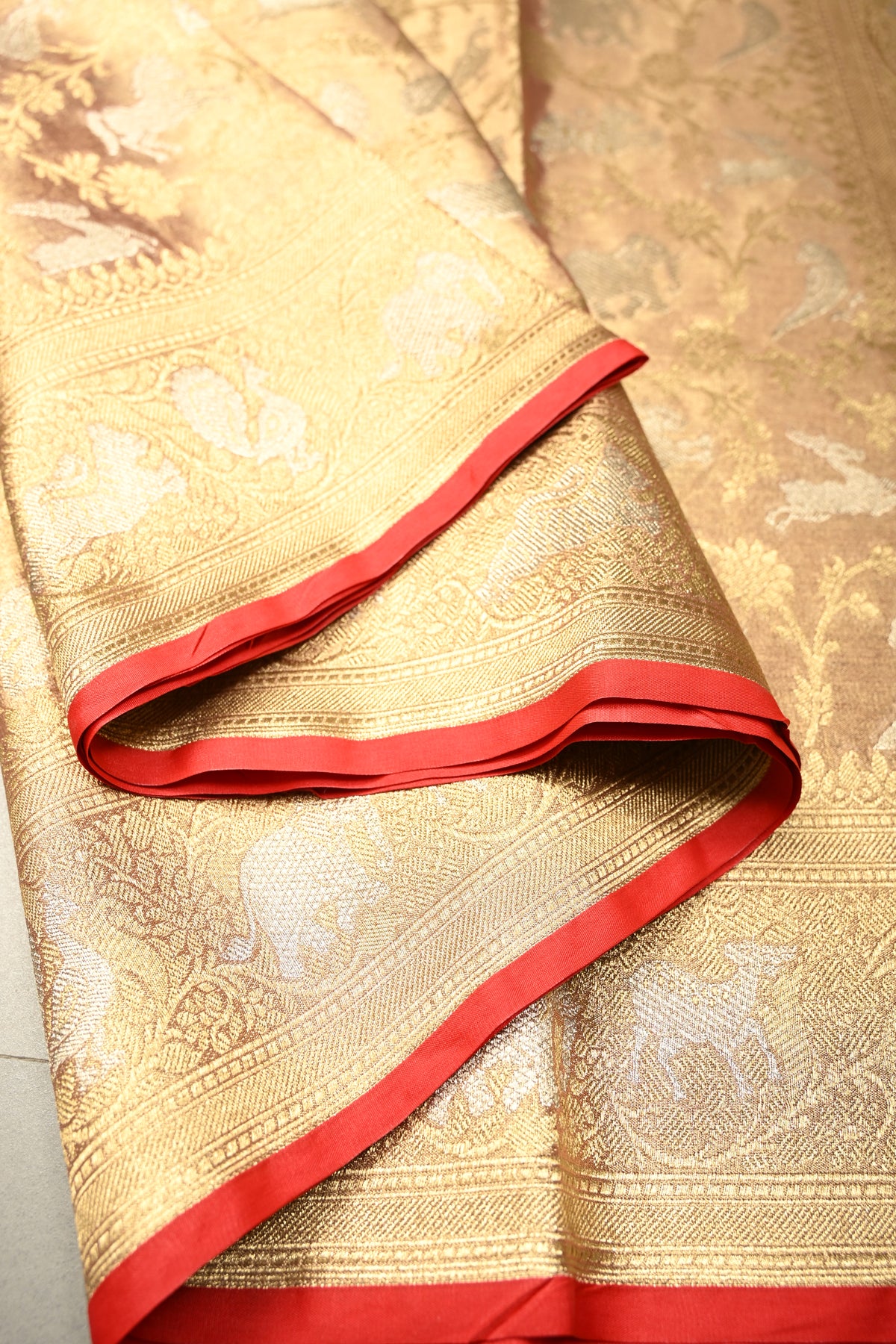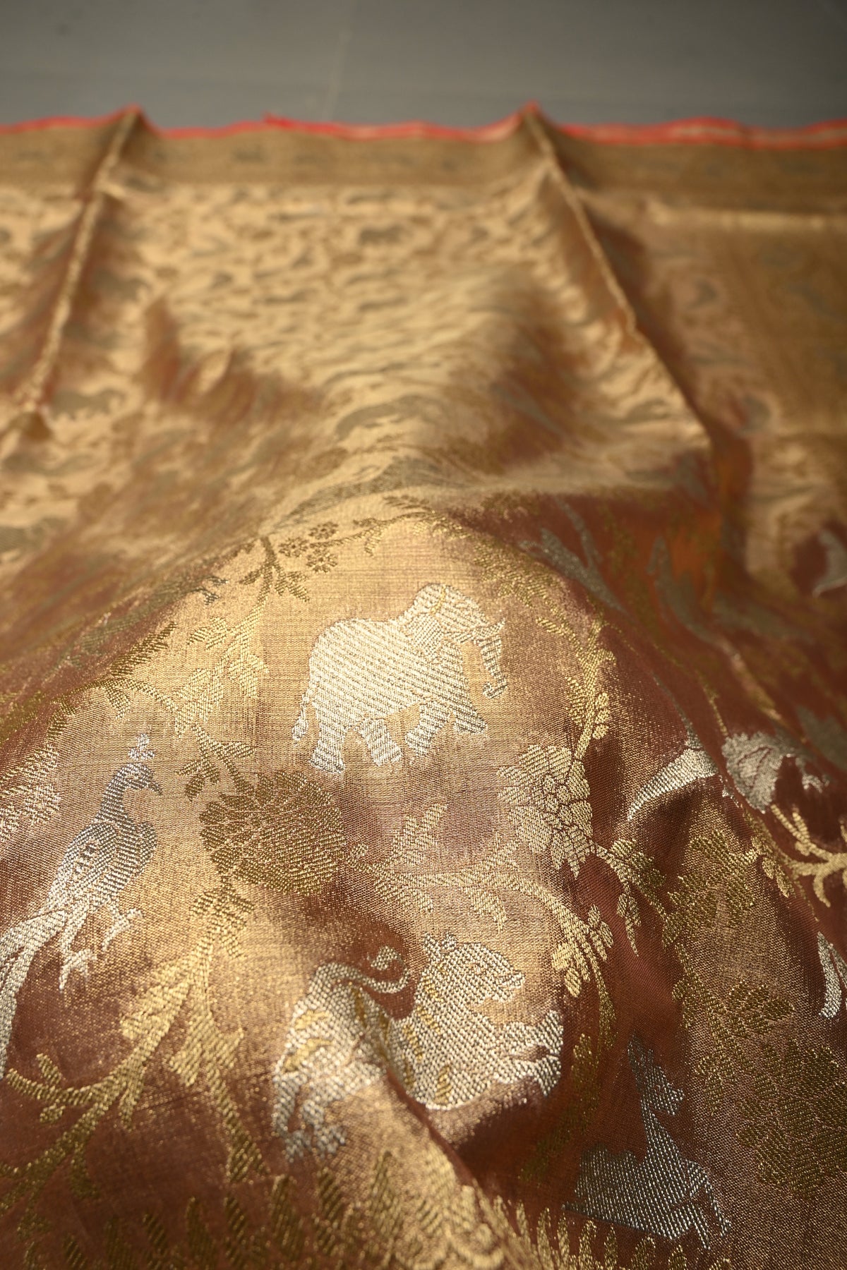 Experience regal elegance with this Light Chikoo Banarasi Vegan Silk Tissue Saree, adorned with an exquisite Alfi Shikargah jaal and a finely detailed border. Crafted from vegan silk tissue, the saree offers a lightweight drape with a subtle, luminous sheen. The intricate Shikargah jaal motifs lend a rich heritage appeal, while the Banarasi weaving and elegant border add timeless sophistication. Perfect for weddings, festive celebrations, or grand occasions, this saree beautifully blends traditional artistry with contemporary, sustainable luxury.