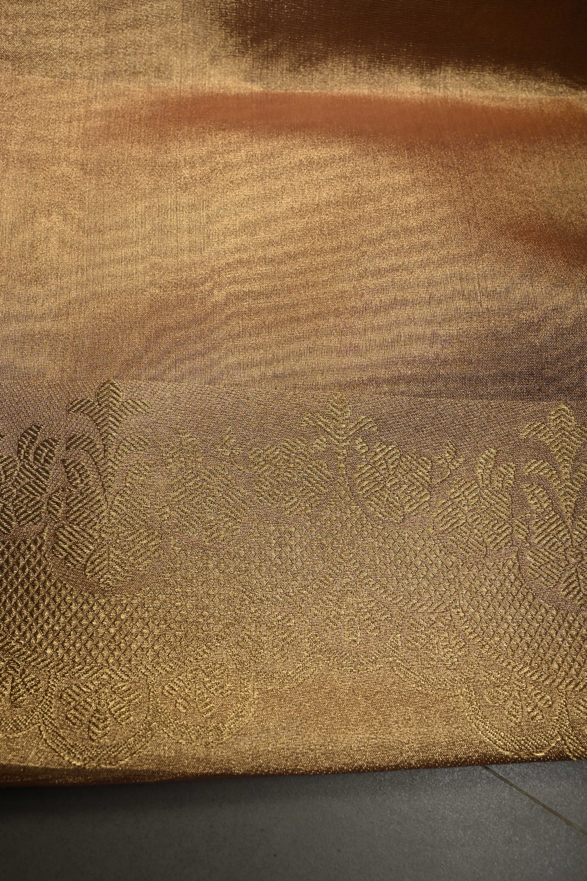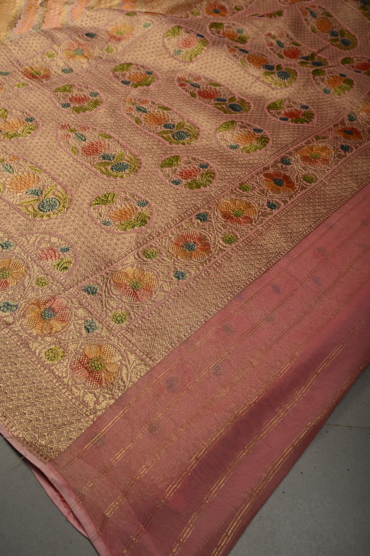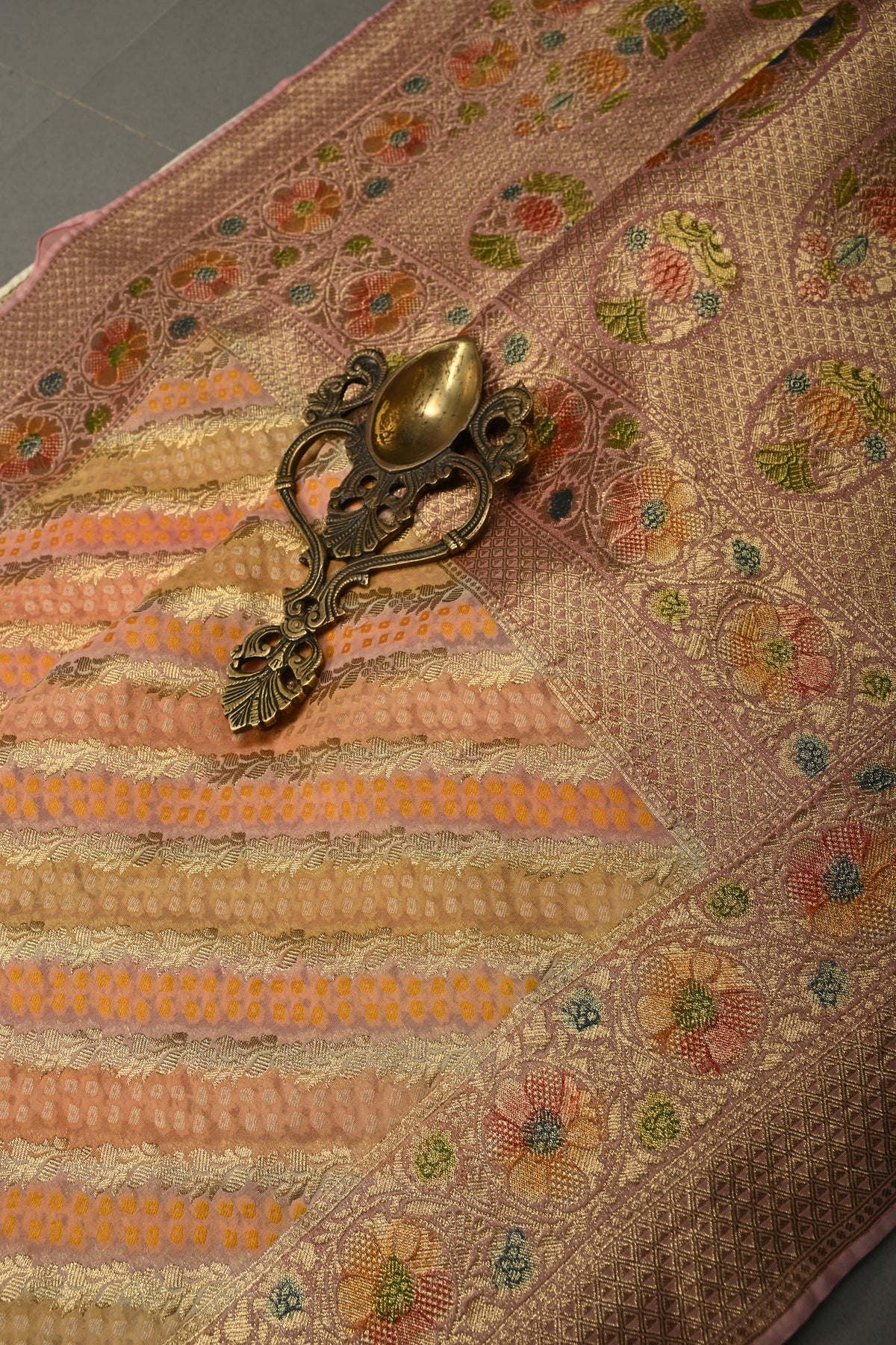 This pastel-hued vegan viscose georgette saree is a delicate blend of elegance and artistry. Featuring a soft diagonal pattern highlighted with intricate zari detailing, it adds a subtle shimmer to the lightweight fabric. The rangkaat-style brush dye creates a graceful, flowing gradient of pastel shades, while carefully woven borders frame the saree beautifully. Comfortable and airy, it drapes effortlessly, making it perfect for festive gatherings, weddings, or daytime celebrations with a touch of understated charm.