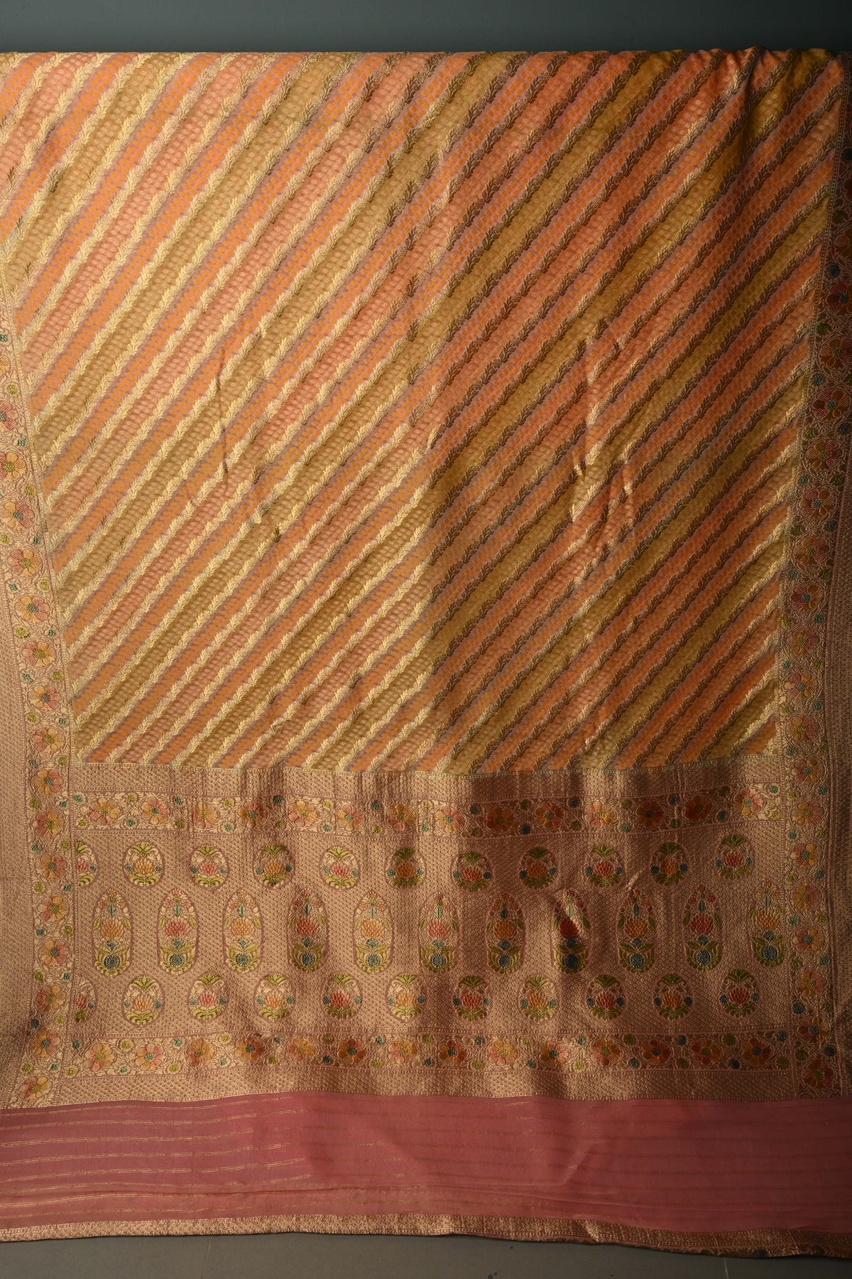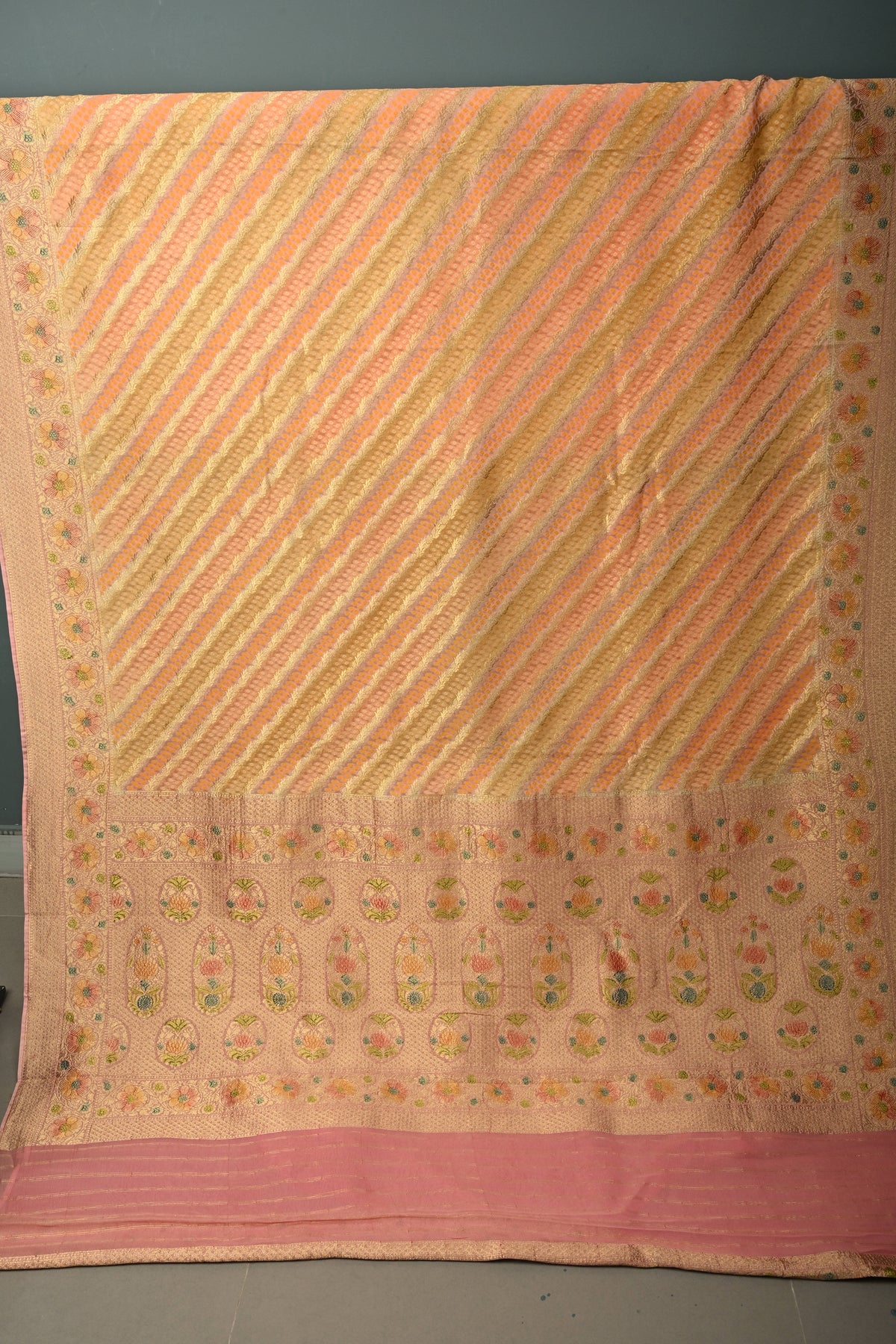 Pastel Hued Diagonal Pattern Zari Detailing on Vegan Viscose Georgette Saree with Rangkaat Style Brush Dye and Borders
