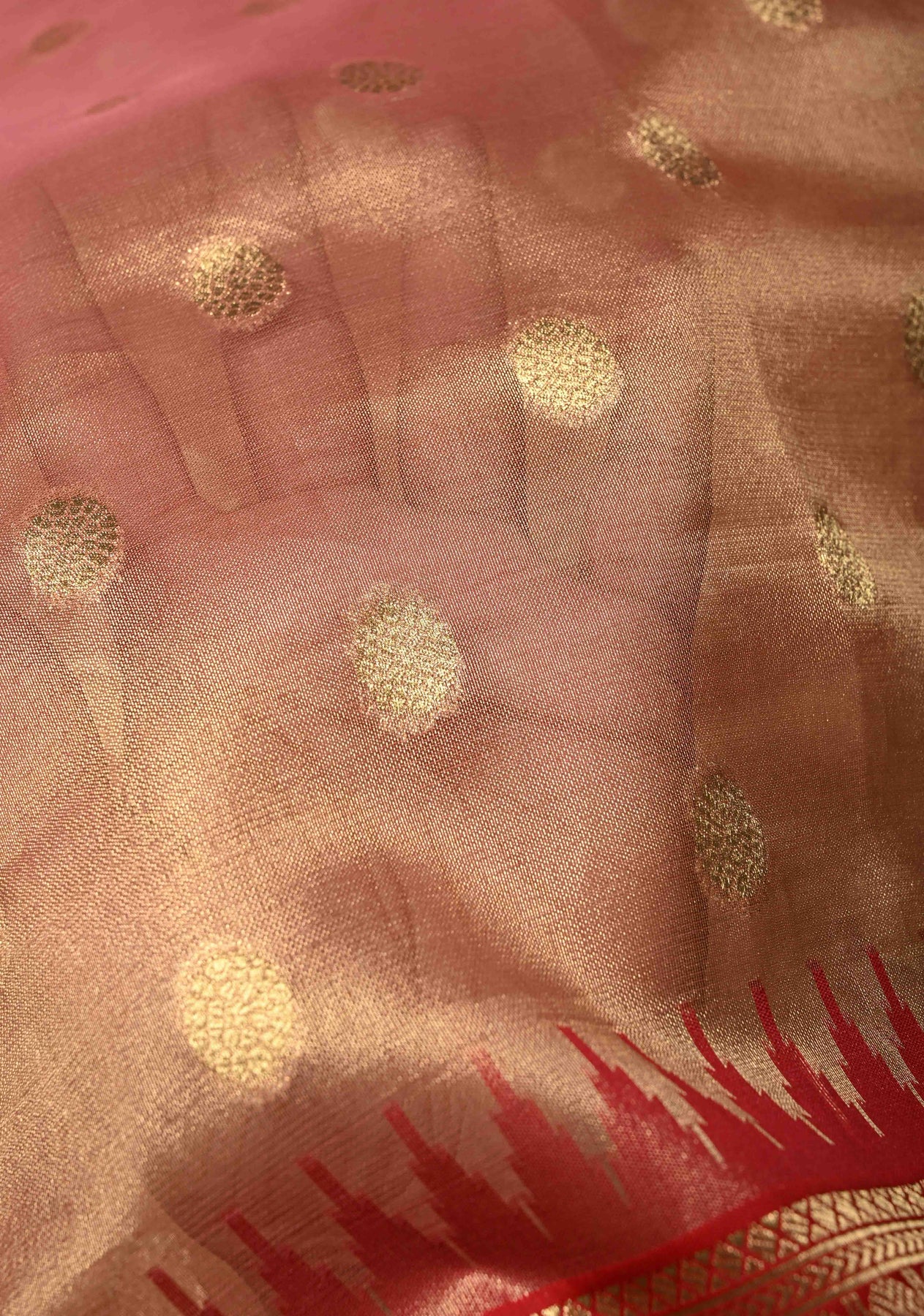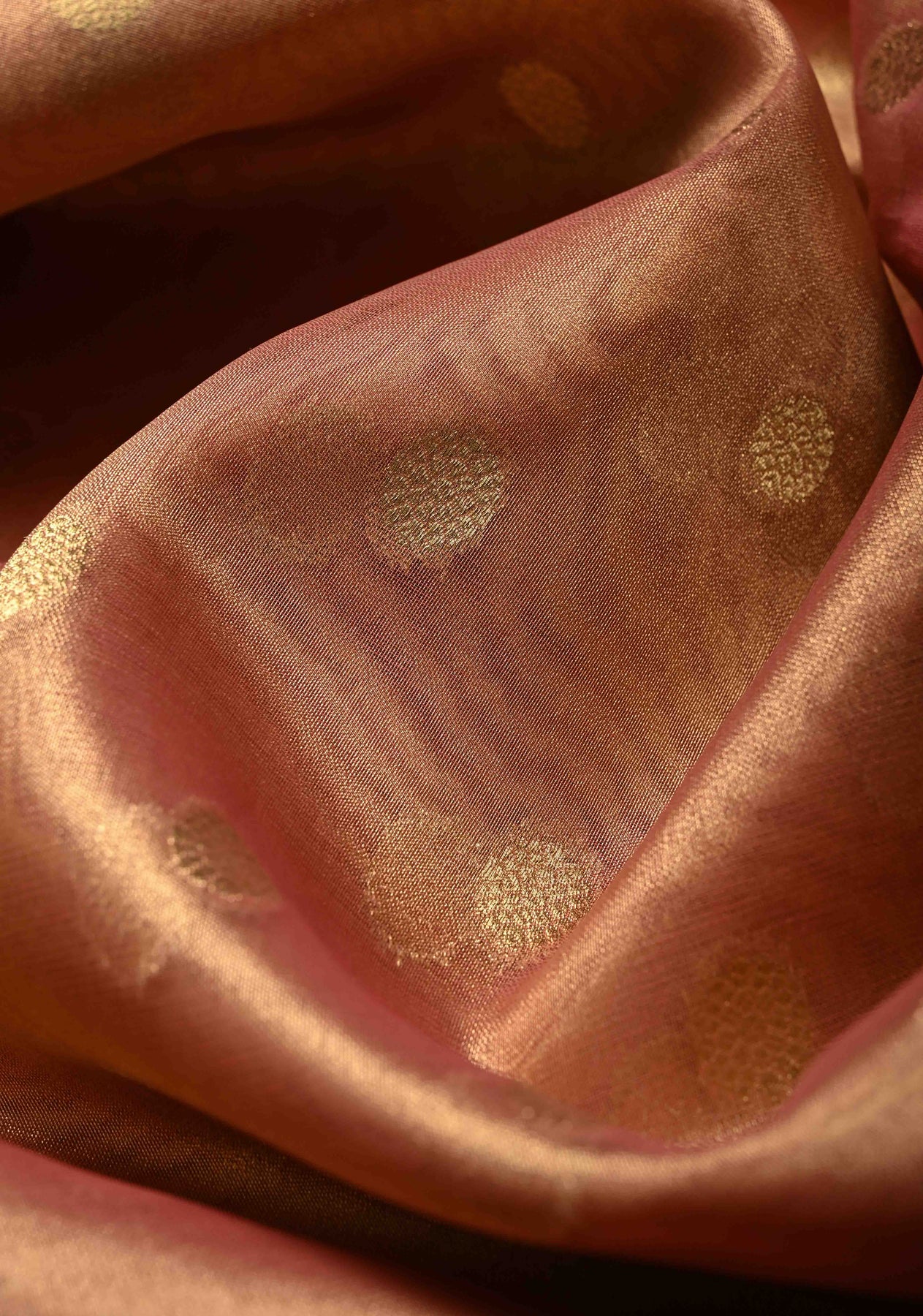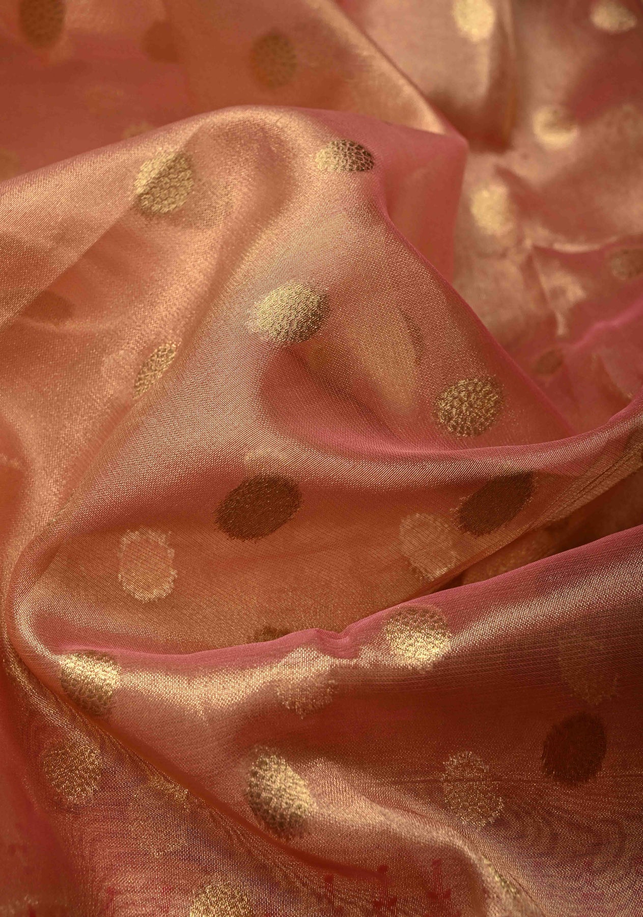 This Banarasi Vegan Silk Tissue Saree in a radiant pink-gold palette is a celebration of refined elegance and heritage craftsmanship. The saree is adorned with delicate pink-gold zari buttas that shimmer gracefully against the sheer tissue base, creating a luxurious visual appeal. A classic zari border adds richness and structure, while the contrasting Ikkat pallu introduces a touch of artisanal charm with its bold patterns and cultural depth. Lightweight yet opulent, this saree is perfect for weddings, festive occasions, and elegant soirées.
