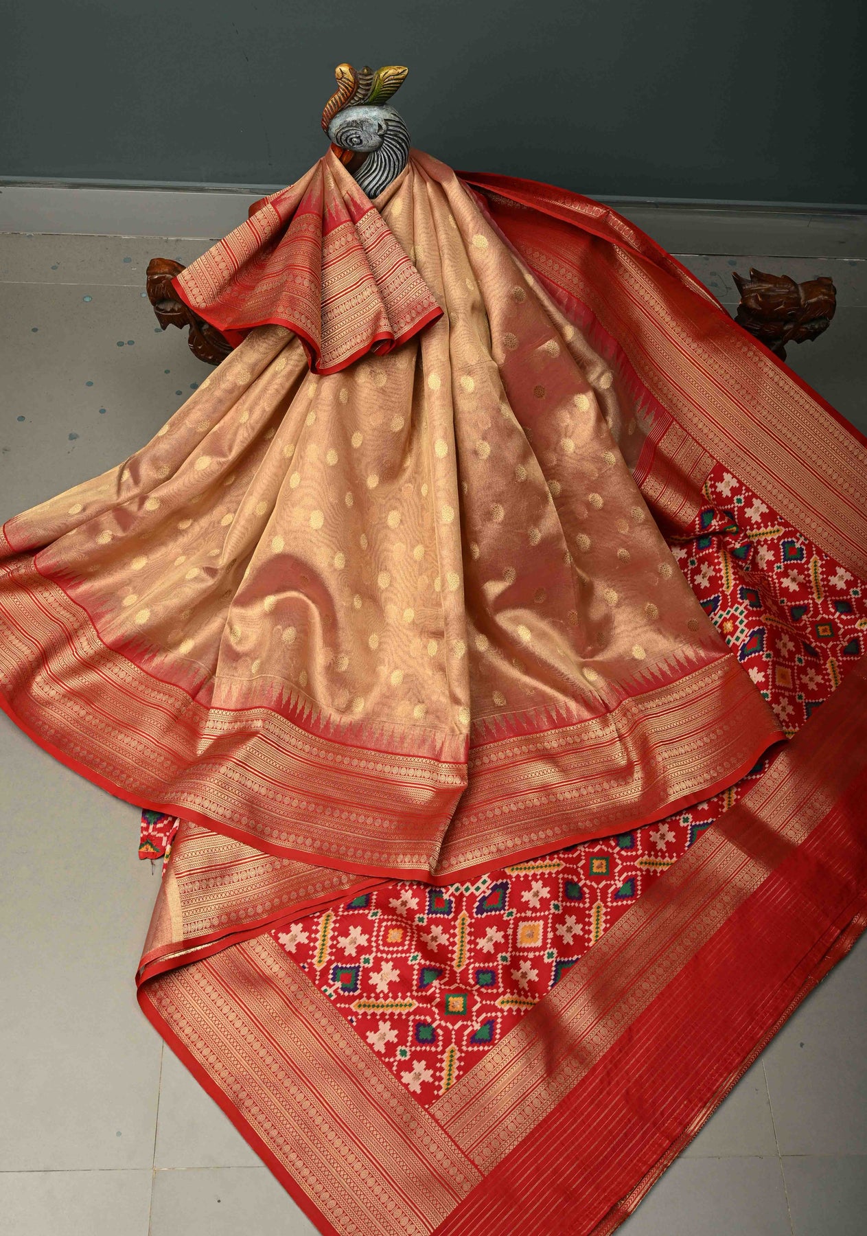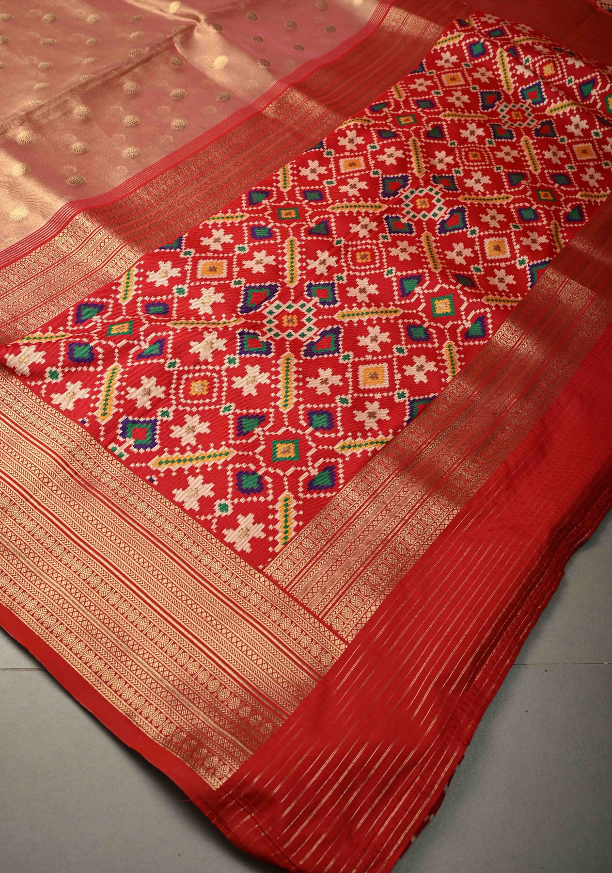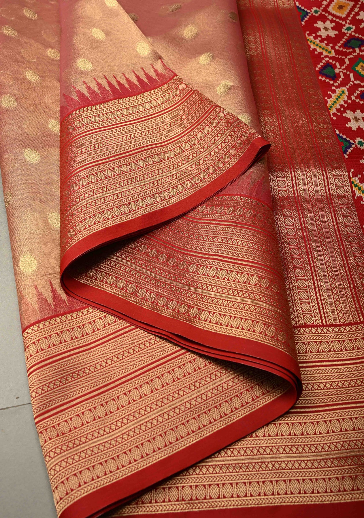 This Banarasi Vegan Silk Tissue Saree in a radiant pink-gold palette is a celebration of refined elegance and heritage craftsmanship. The saree is adorned with delicate pink-gold zari buttas that shimmer gracefully against the sheer tissue base, creating a luxurious visual appeal. A classic zari border adds richness and structure, while the contrasting Ikkat pallu introduces a touch of artisanal charm with its bold patterns and cultural depth. Lightweight yet opulent, this saree is perfect for weddings, festive occasions, and elegant soirées.