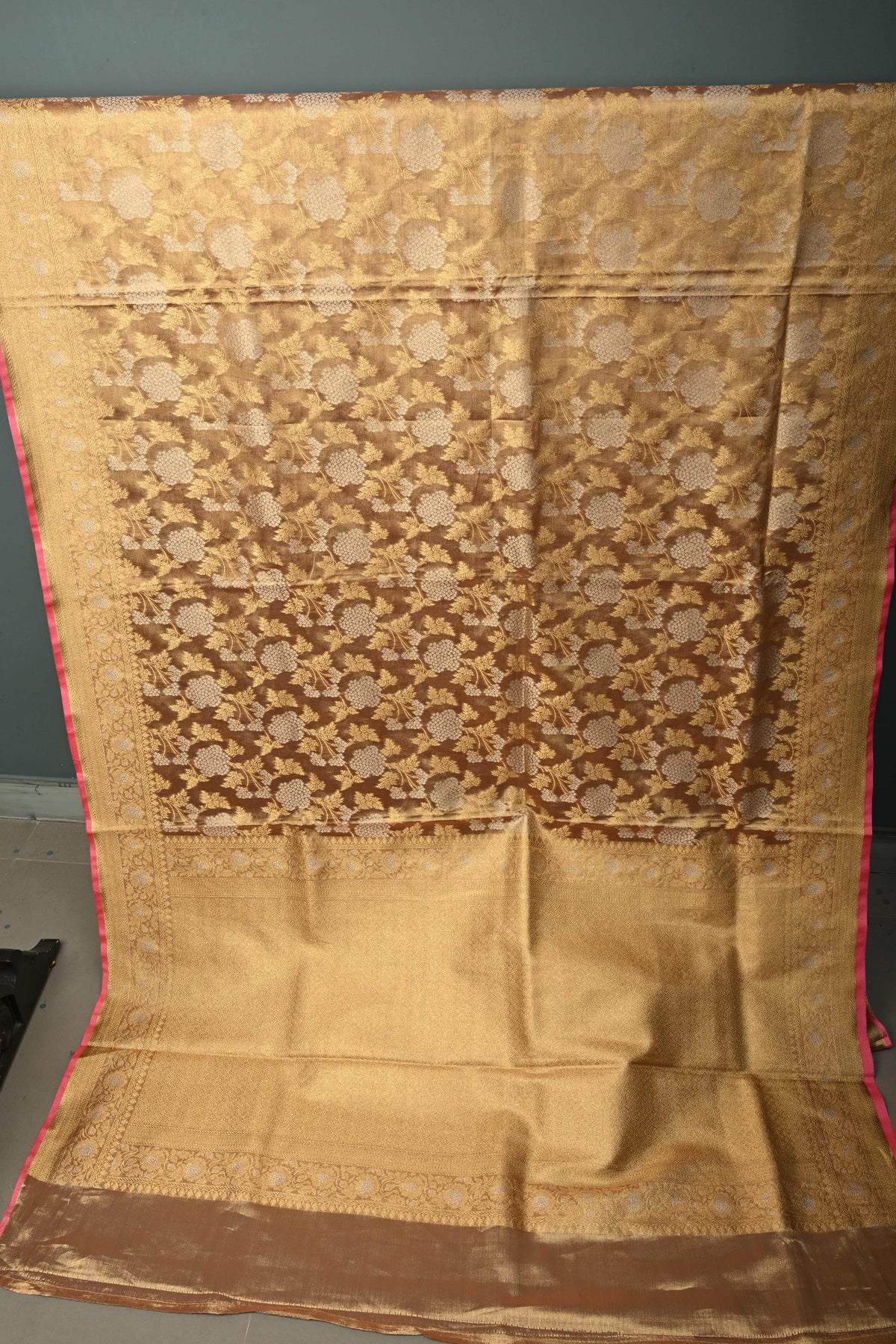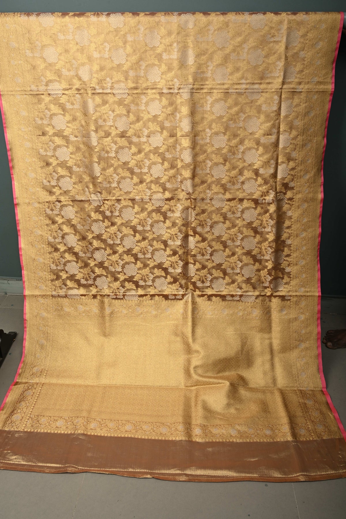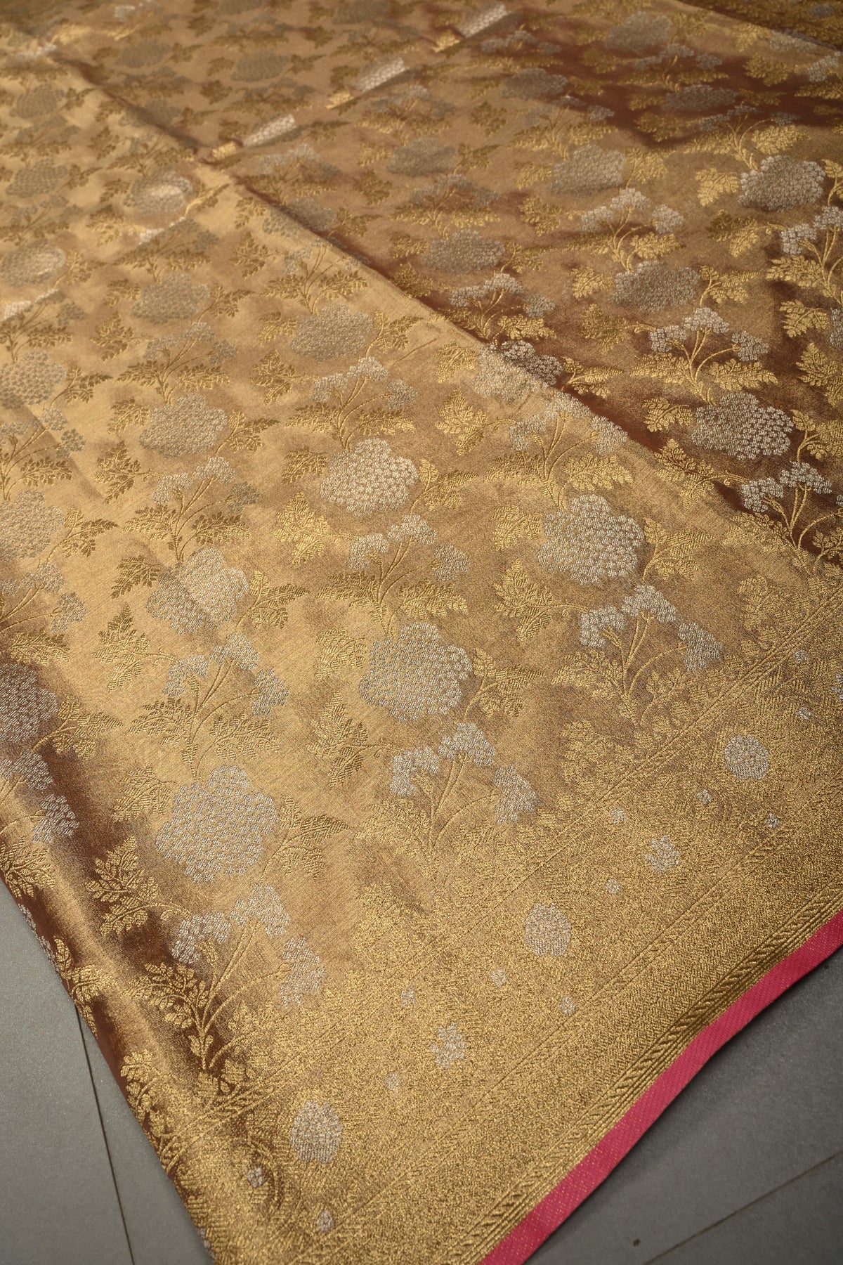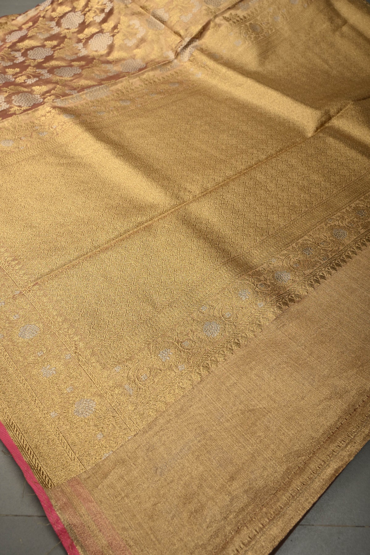 Pink-Gold Banarasi Vegan Silk Tissue Saree with Alfi Floral Jaal Brocade and Border