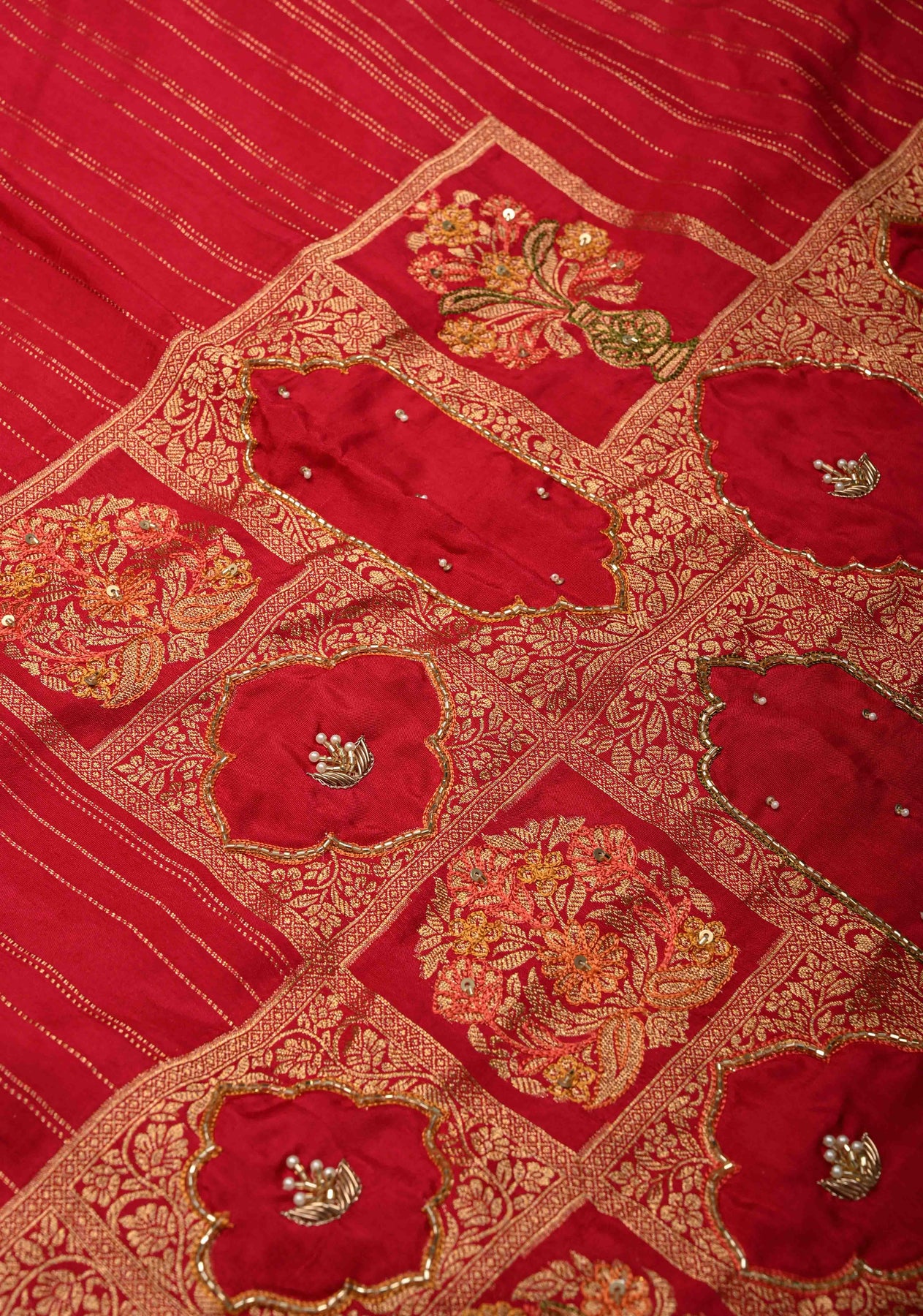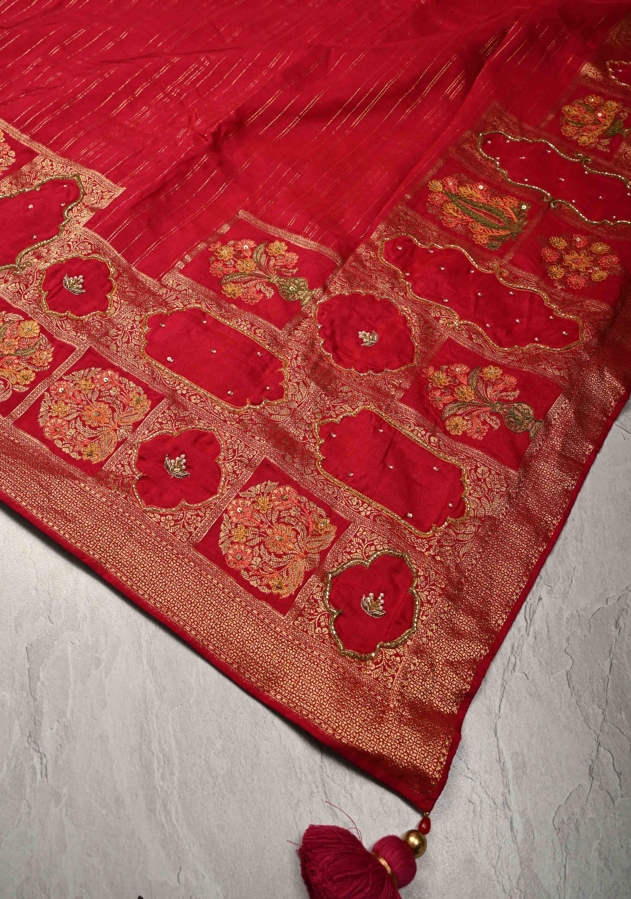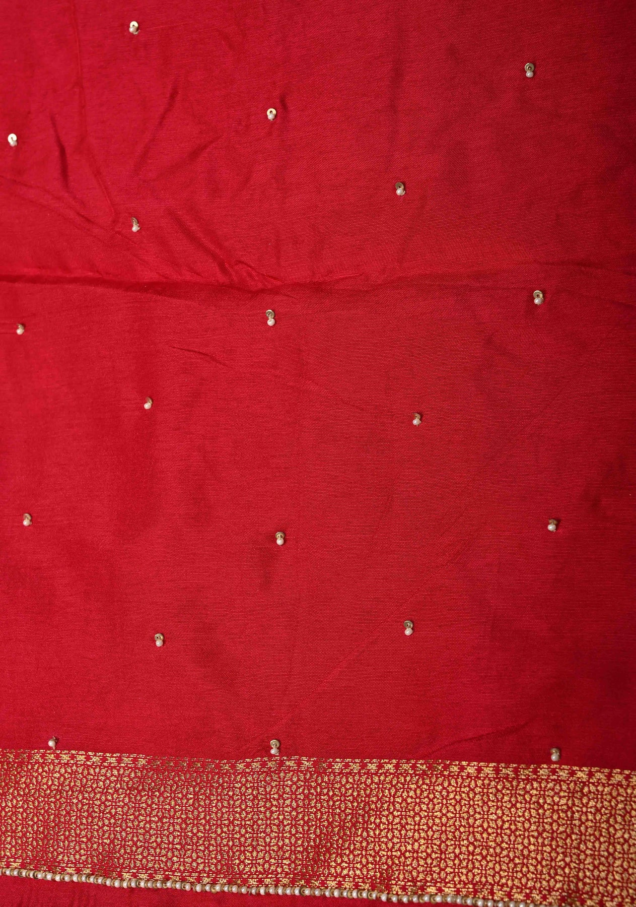 This saree is ready to wear with fall and pico done. An unstitched blouse fabric is included.