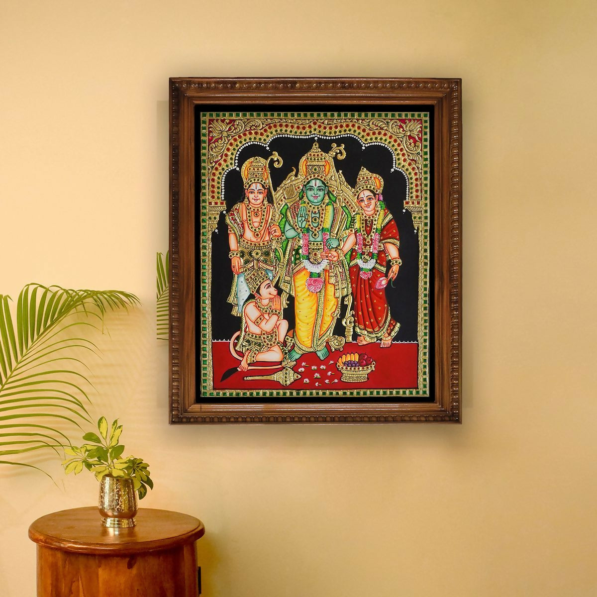 Handcrafted in the traditional Tanjore painting style, the artwork is adorned with 22ct pure gold foil, meticulously applied by skilled artisans using age-old techniques. The radiant gold embellishments enhance the grandeur and sacred aura of the painting, making it a striking centerpiece for prayer rooms, living spaces, or spiritual collections.