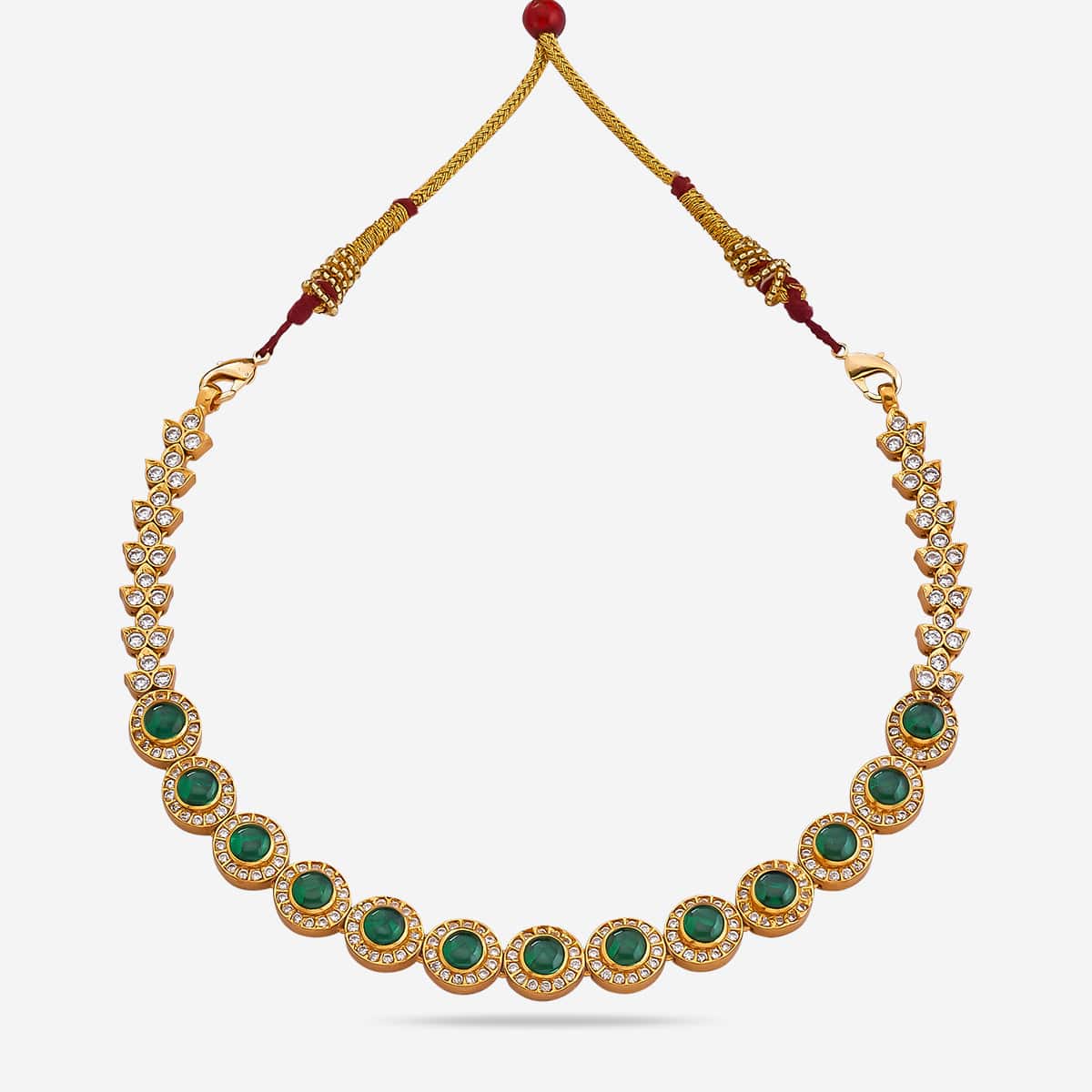 This exquisite emerald necklace is crafted from pure 92.5 silver and elegantly gold-plated for a rich, traditional finish. Studded with sparkling CZ stones and highlighted with emerald accents, it exudes timeless elegance and regal charm. The adjustable dori closure ensures a comfortable and secure fit, making it ideal for weddings, festive occasions, and special celebrations. Designed to elevate ethnic ensembles, this necklace beautifully reflects classic Indian craftsmanship with a contemporary touch.