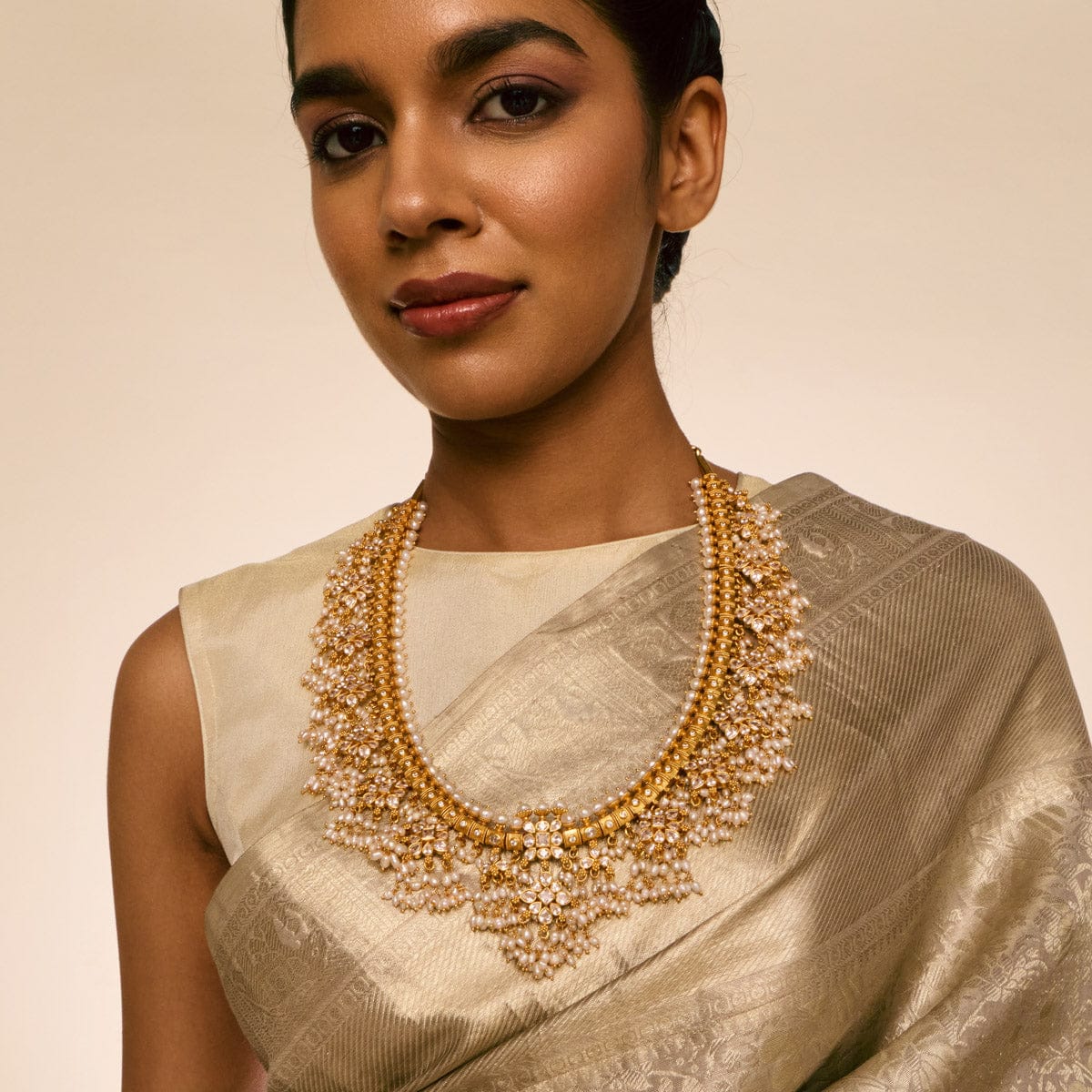 This exquisite Guttapusalu haram is crafted from pure 92.5 sterling silver and elegantly gold plated for a rich, traditional finish. Designed in a timeless floral bloom pattern, it features intricate pearl clusters that cascade gracefully, creating a regal and opulent look. Perfect for weddings, temple jewelry styling, and festive occasions, this classic haram beautifully reflects South Indian heritage craftsmanship and royal elegance.