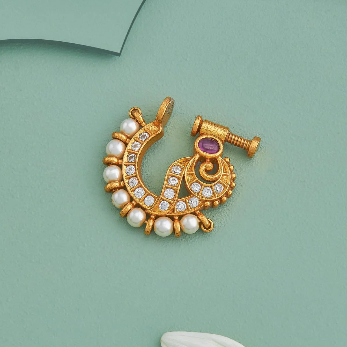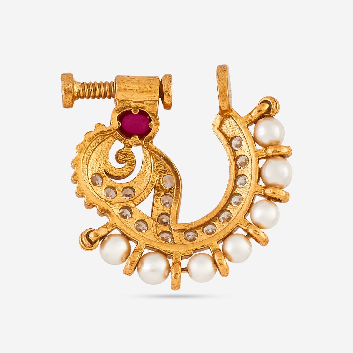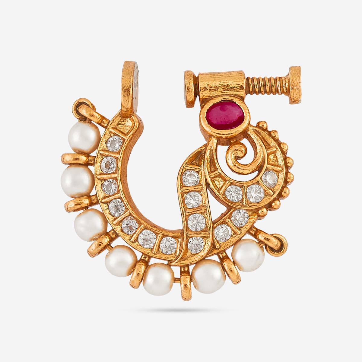 Elevate your traditional look with this exquisite Nath crafted from 92.5% pure silver and plated in gold. Adorned with vibrant ruby stones and delicate pearls, this nath radiates elegance and festive charm.