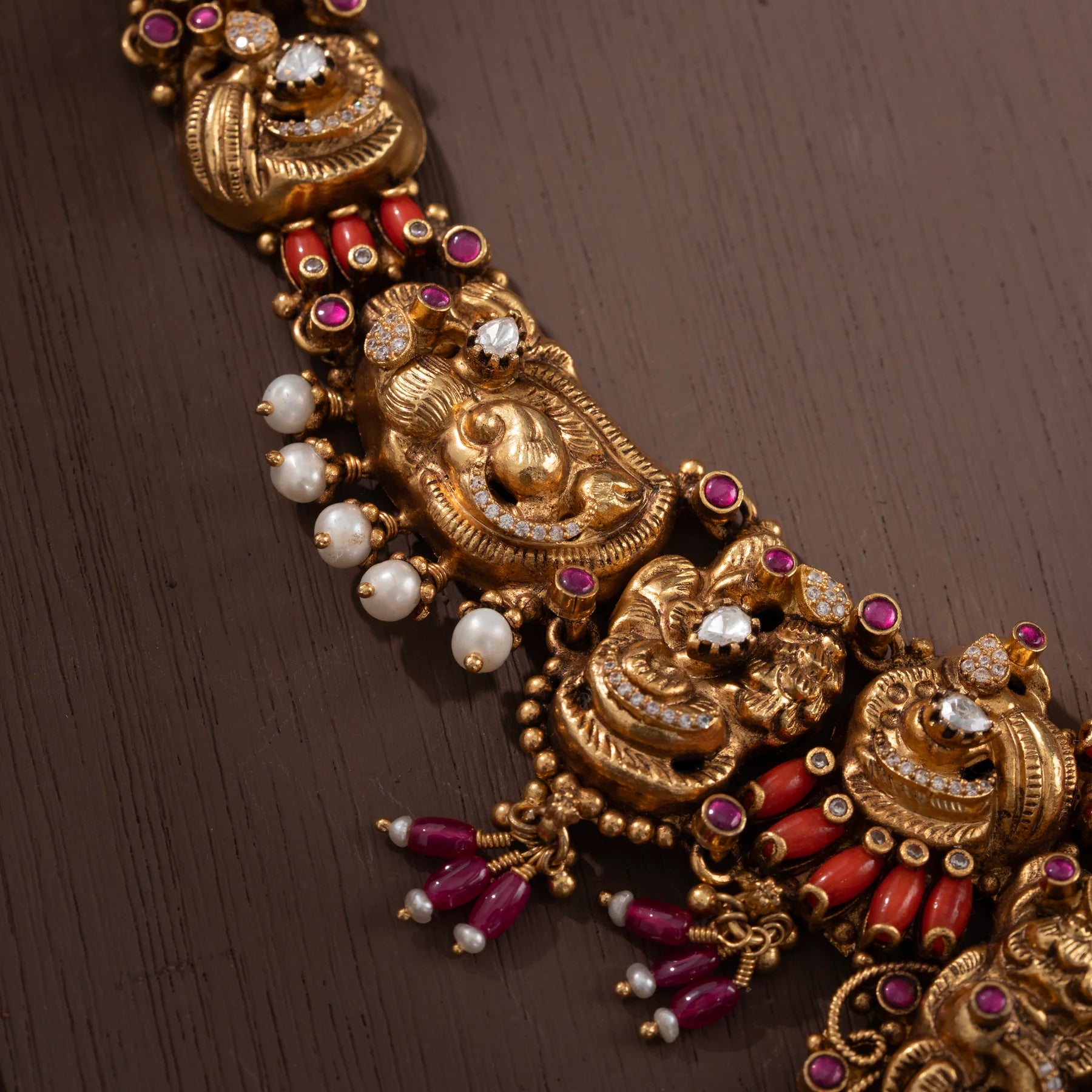 The Ishwari Mor Haaram showcases an intricately designed Peacock motif adorned with sparkling Moissanite and Cubic Zirconia stones, enhanced by vibrant Rubies. This exquisite piece is further elevated with delicate Ruby and Pearl hangings, offering a harmonious blend of elegance and tradition perfect for special occasions.