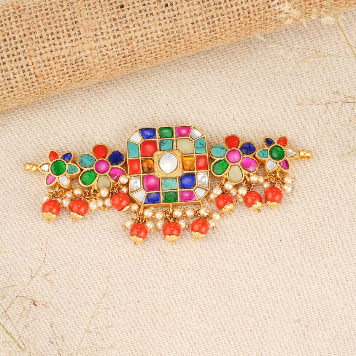 This 92.5 Silver, 24 kt Gold-Plated Mini Choker set is adorned with Semi-precious Kundan Stones for a luxurious aesthetic. Navratna is an exquisite piece of Indian jewellery that has been a symbol of royalty for centuries. This timeless jewellery style remains a popular fashion choice, providing an enduringly fashionable elegance to any outfit.