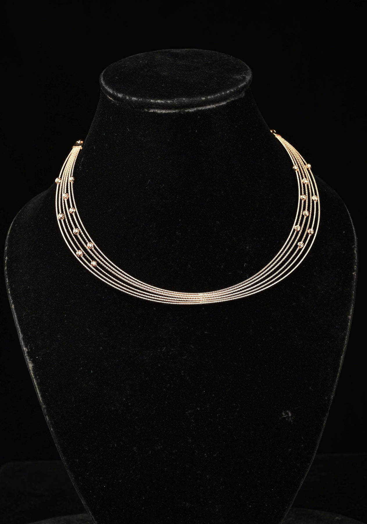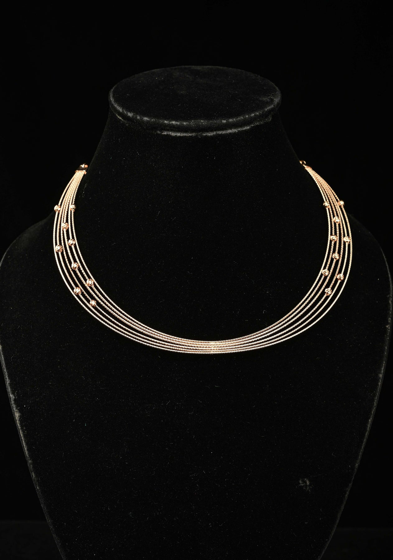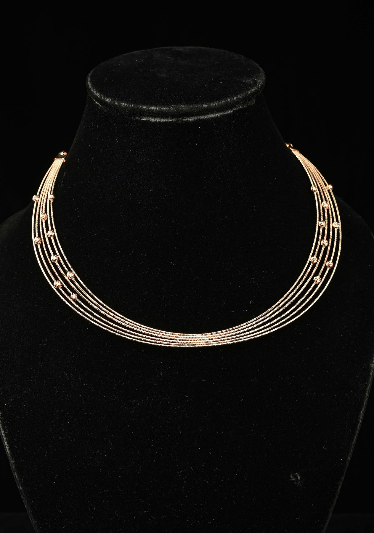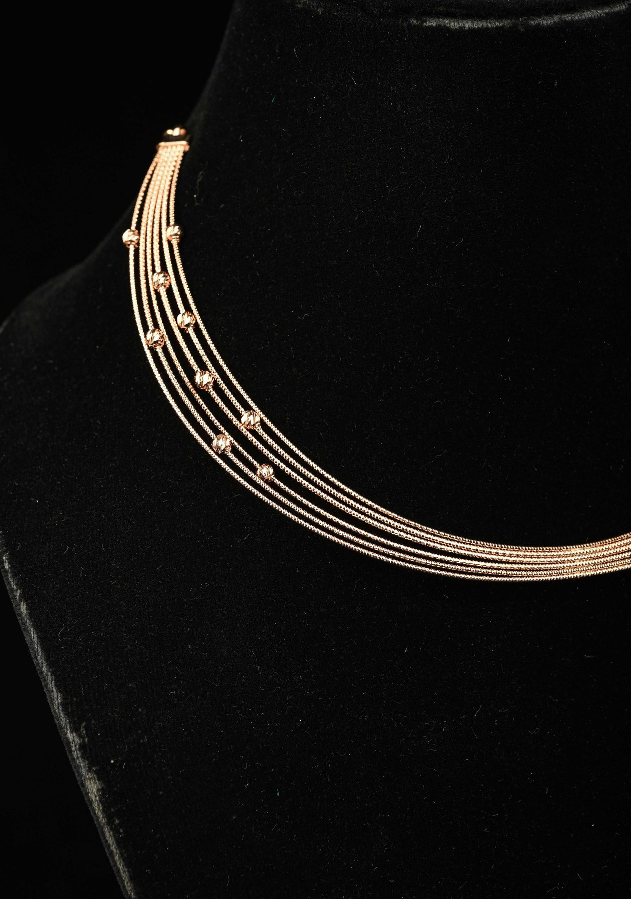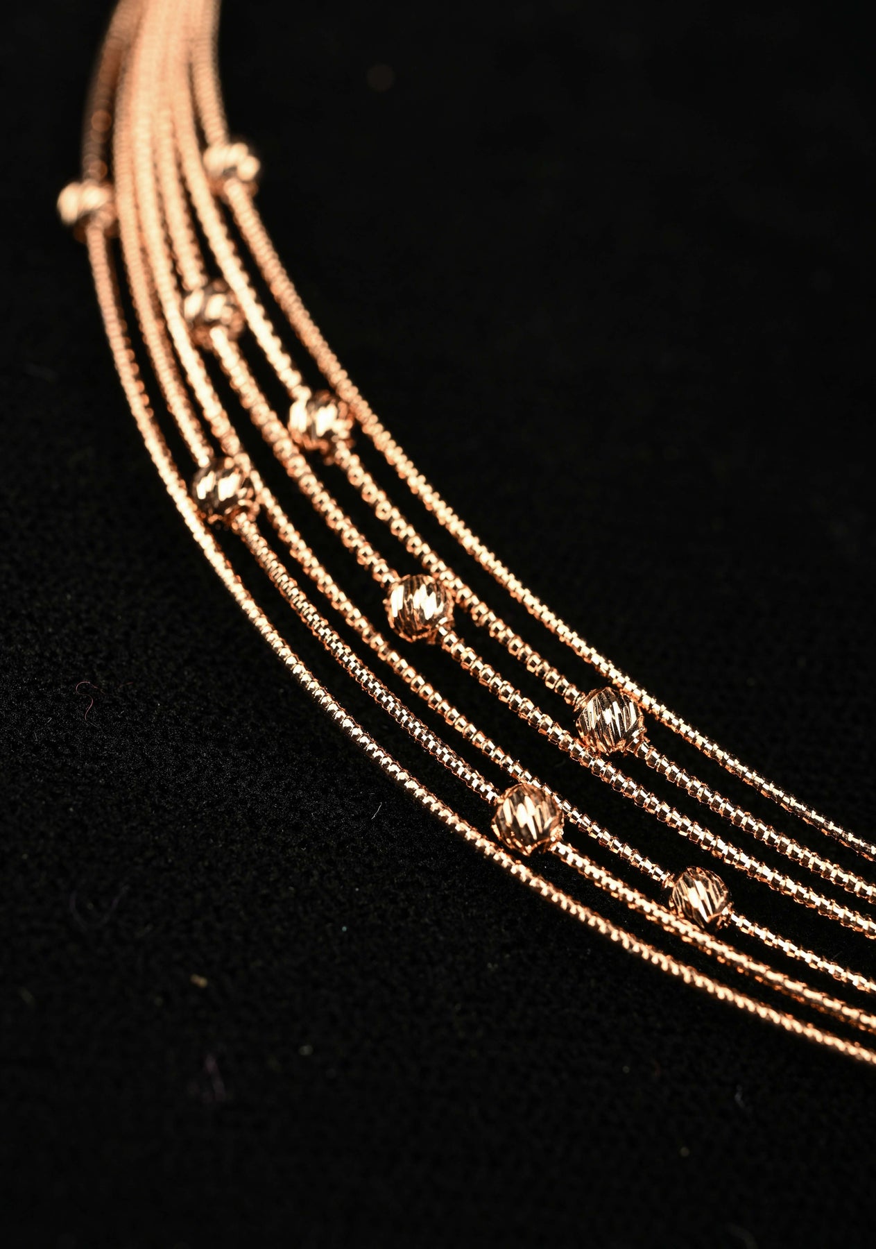 This 92.5 silver, rose gold-plated Multilayer choker necklace with bead accents beautifully combines classic craftsmanship with modern flair. Featuring multiple finely crafted silver multi layered together and enhanced with delicate bead accents, this necklace offers a rich, textured look with a warm golden glow. The gold plating adds a luxurious finish, making it perfect for weddings, festive events, or any occasion where you want to make a stylish statement. Lightweight and comfortable, it complements both traditional and contemporary outfits effortlessly.