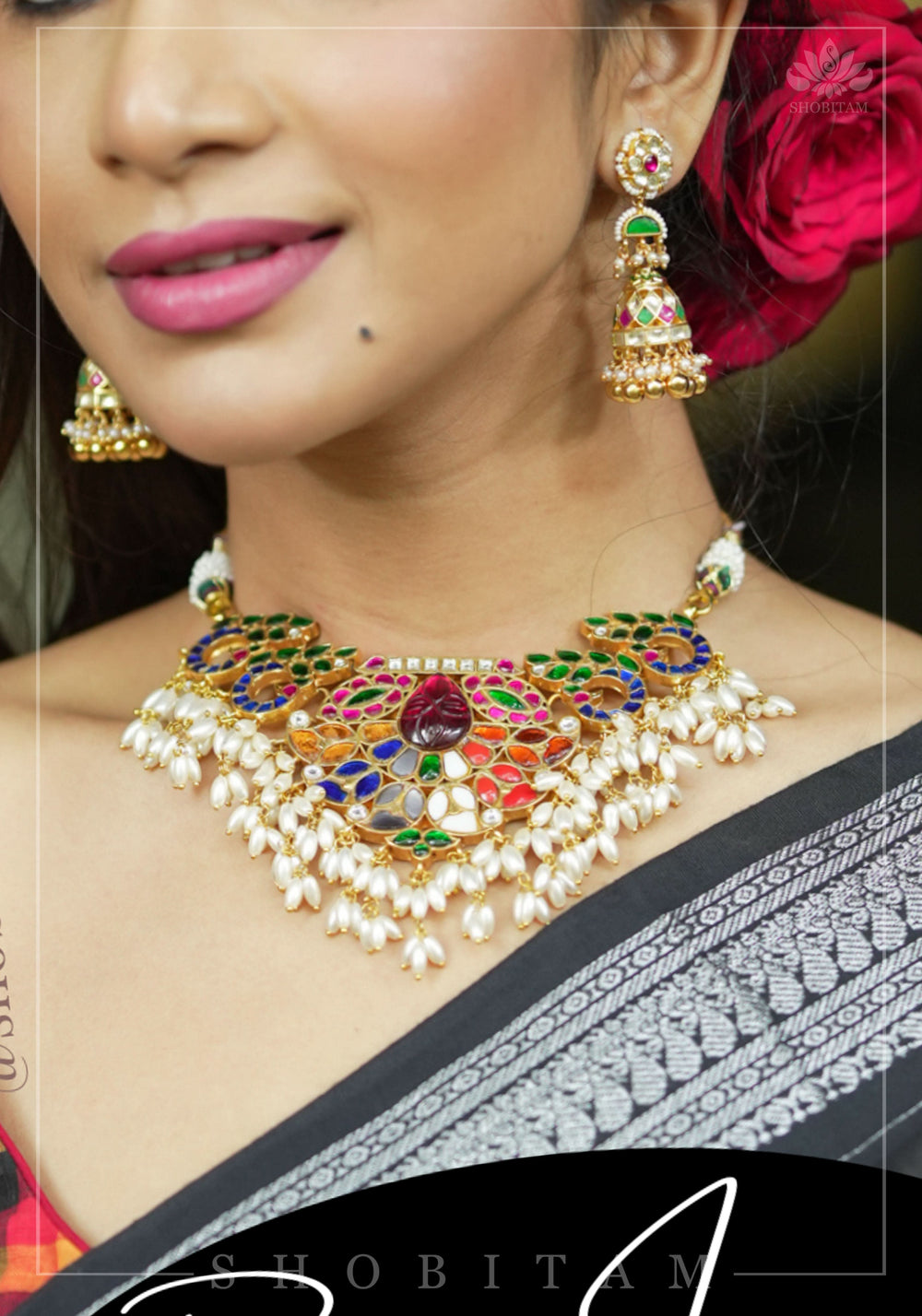 A standout neckpiece infused with Multi colored stones, with a statement pendant and colorful peacock sides. This is completely handmade and the natural stones are embedded in the noteworthy jadau technique. Dangling clusters of rice pearls add to the vintage charm of it! A close look at this necklace with have you marvel at the exquisite details.