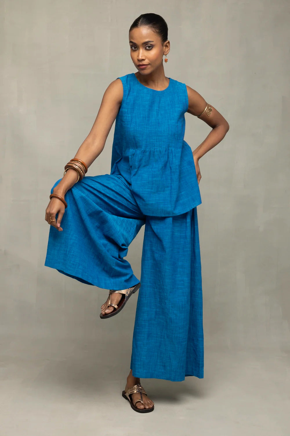The top comes in a straight, easy fit with a gently flared silhouette that allows fluid movement and all-day comfort. It features a classic round neckline. The pants are designed in a relaxed, wide-leg fit, offering a graceful drape and a flattering length that elongates the silhouette.