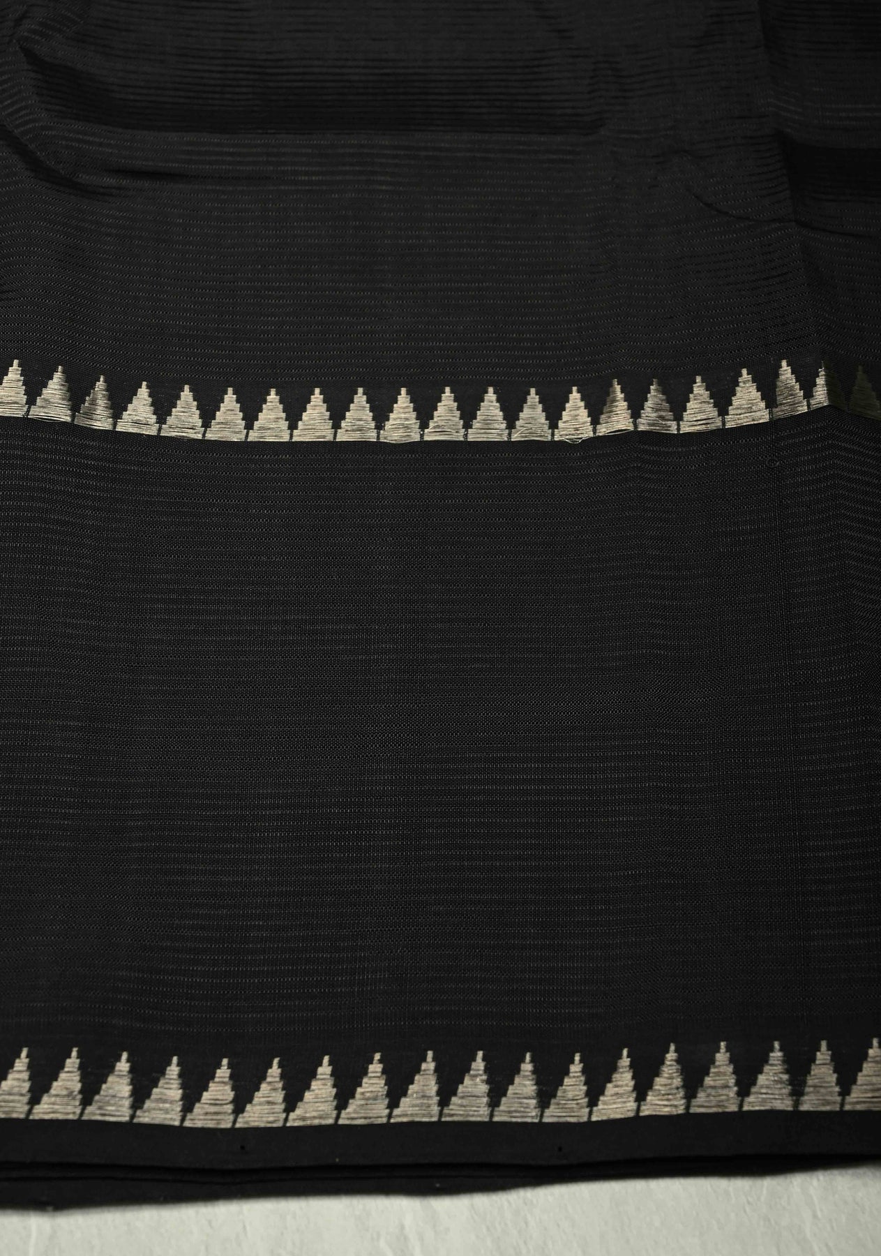 Make a bold yet elegant statement with this Black Handwoven Mangalagiri Silk Cotton Saree, a timeless piece that blends tradition with sophistication. Expertly woven in the heritage town of Mangalagiri, this saree features a rich silk-cotton blend known for its durability, soft texture, and graceful drape. The deep black body is beautifully contrasted by a wide temple-style zari border, adding a touch of regal charm. Lightweight and breathable, it is ideal for festive occasions, formal gatherings, or classic everyday elegance. A must-have for lovers of authentic handloom weaves.