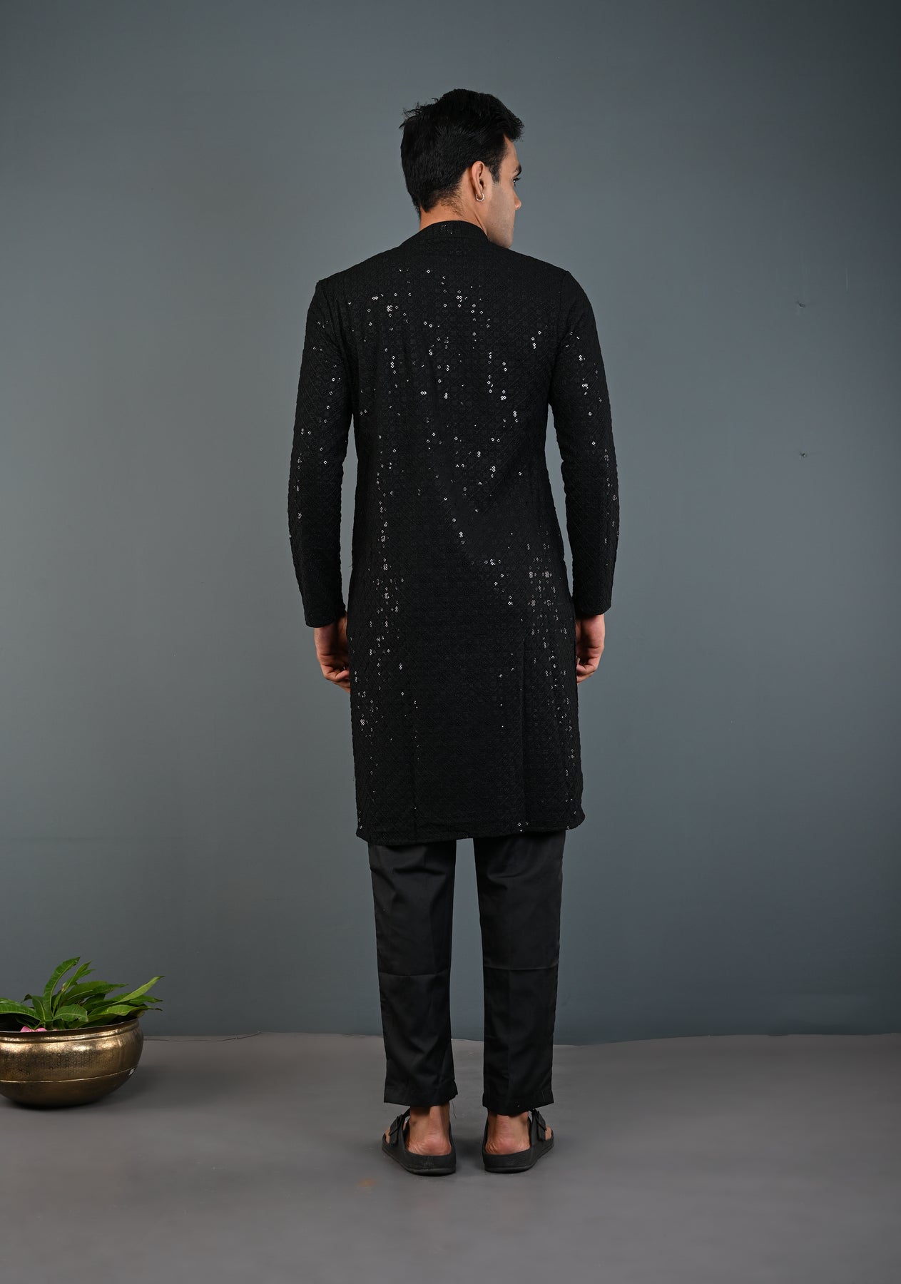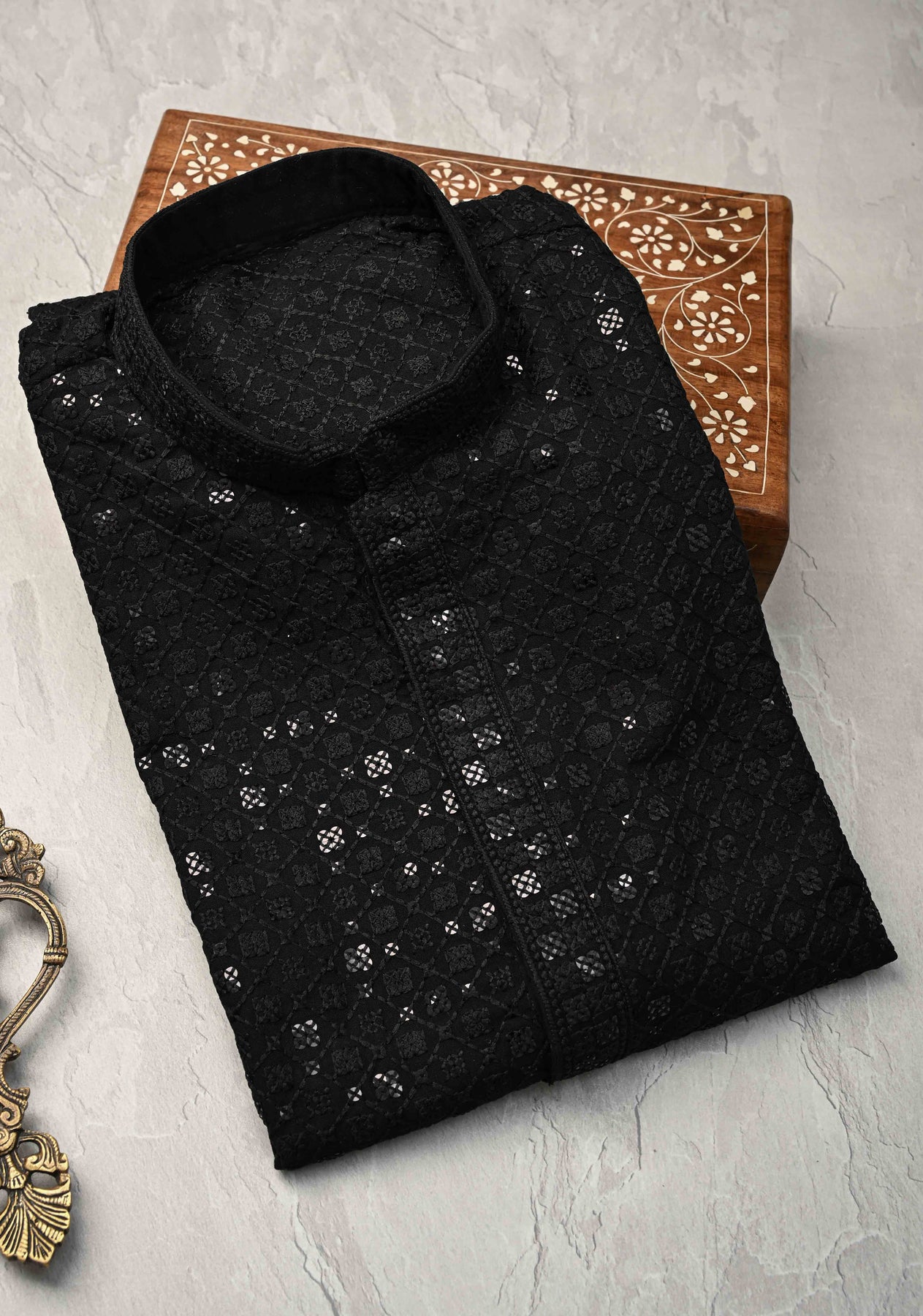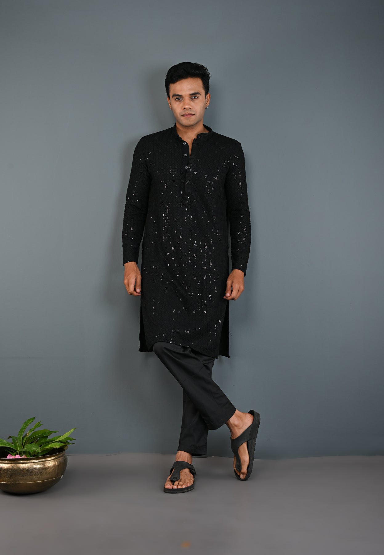 Black Chikankari Kurta with Sequins and Pajama Set for Men | Made to Order
