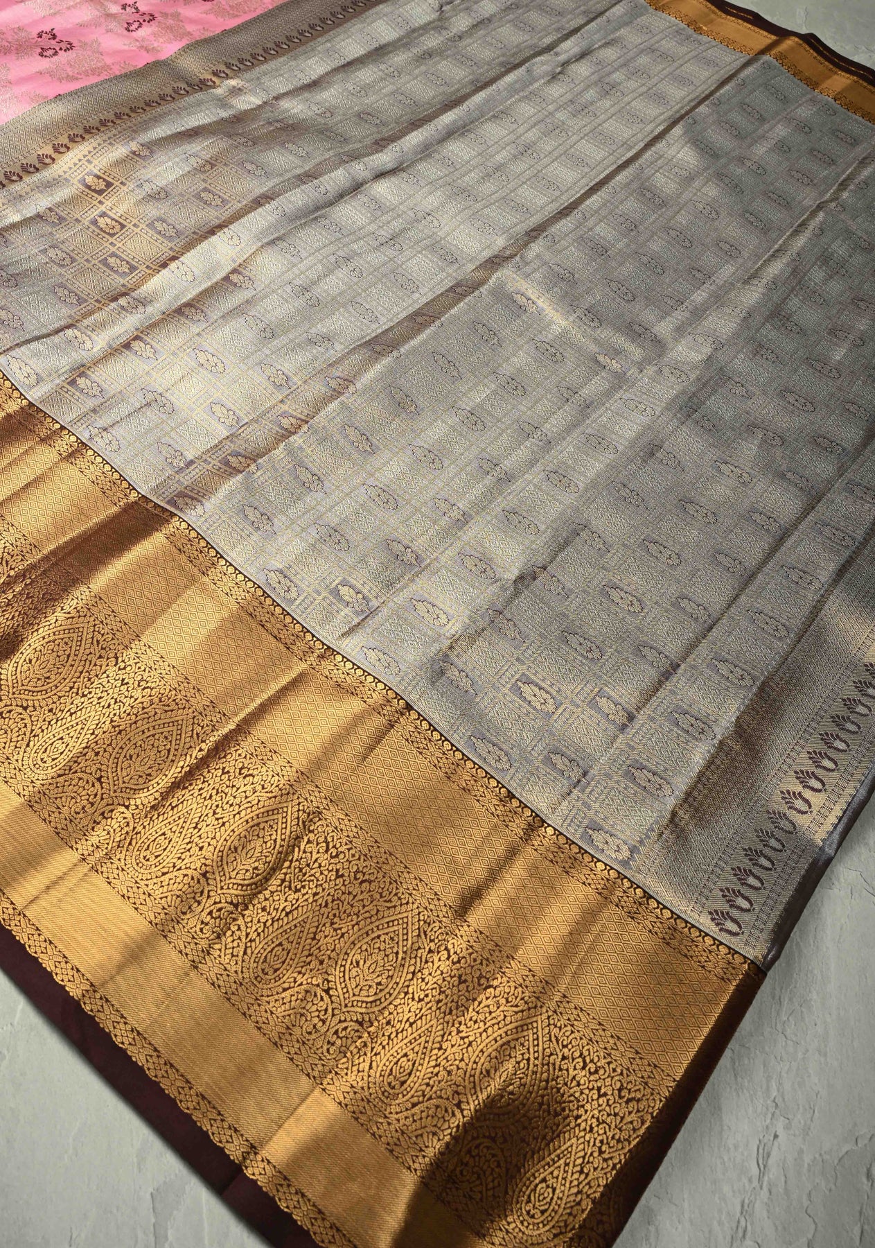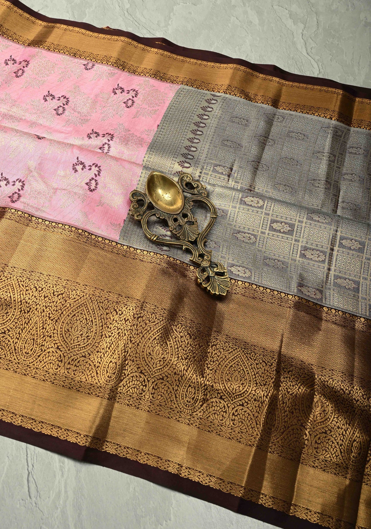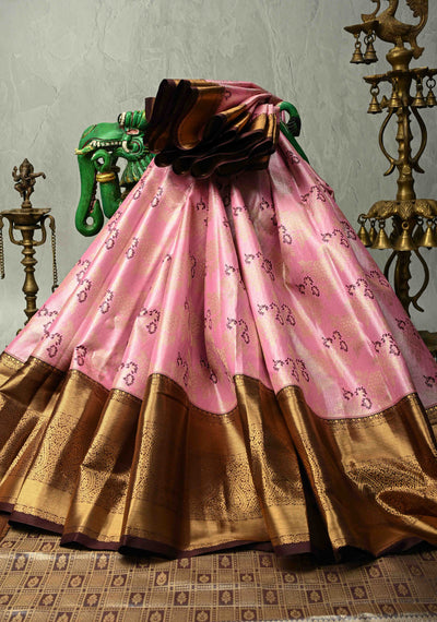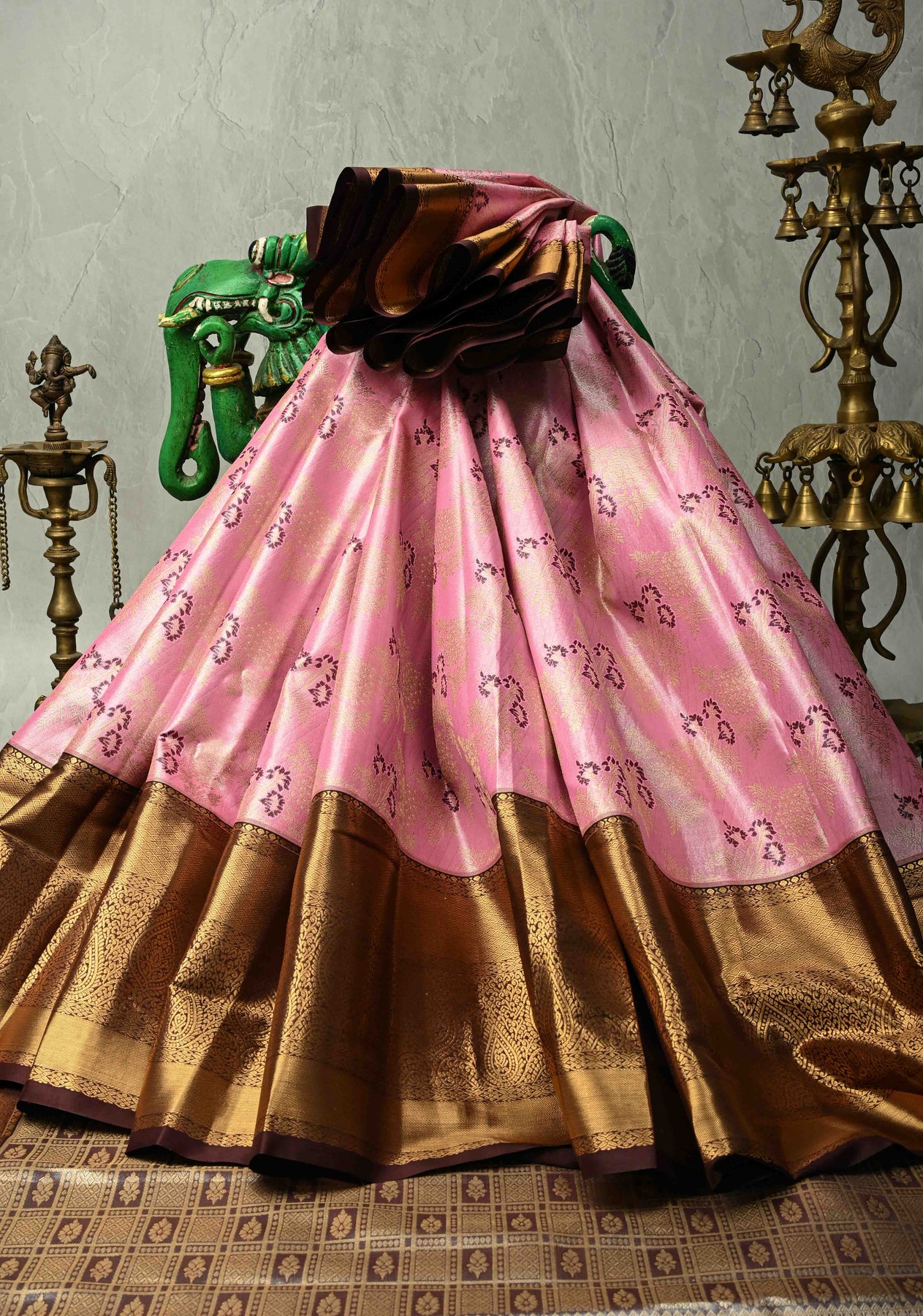 Add a pop of elegance to your wardrobe with this Bubblegum Pink Kanjivaram Tissue Semi Silk Saree. Crafted with fine tissue semi silk, it offers a delicate sheen and lightweight drape, perfect for festive occasions and weddings.
