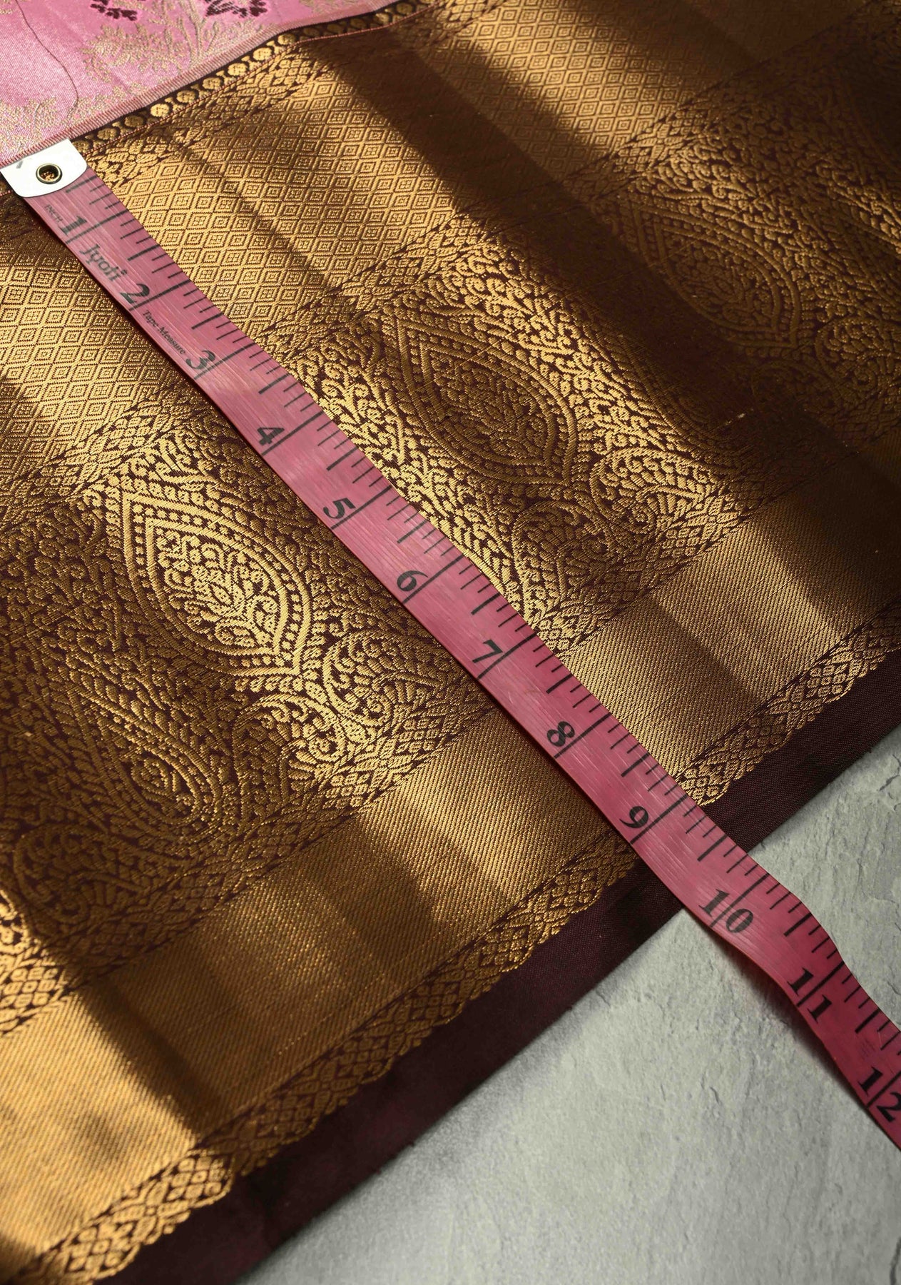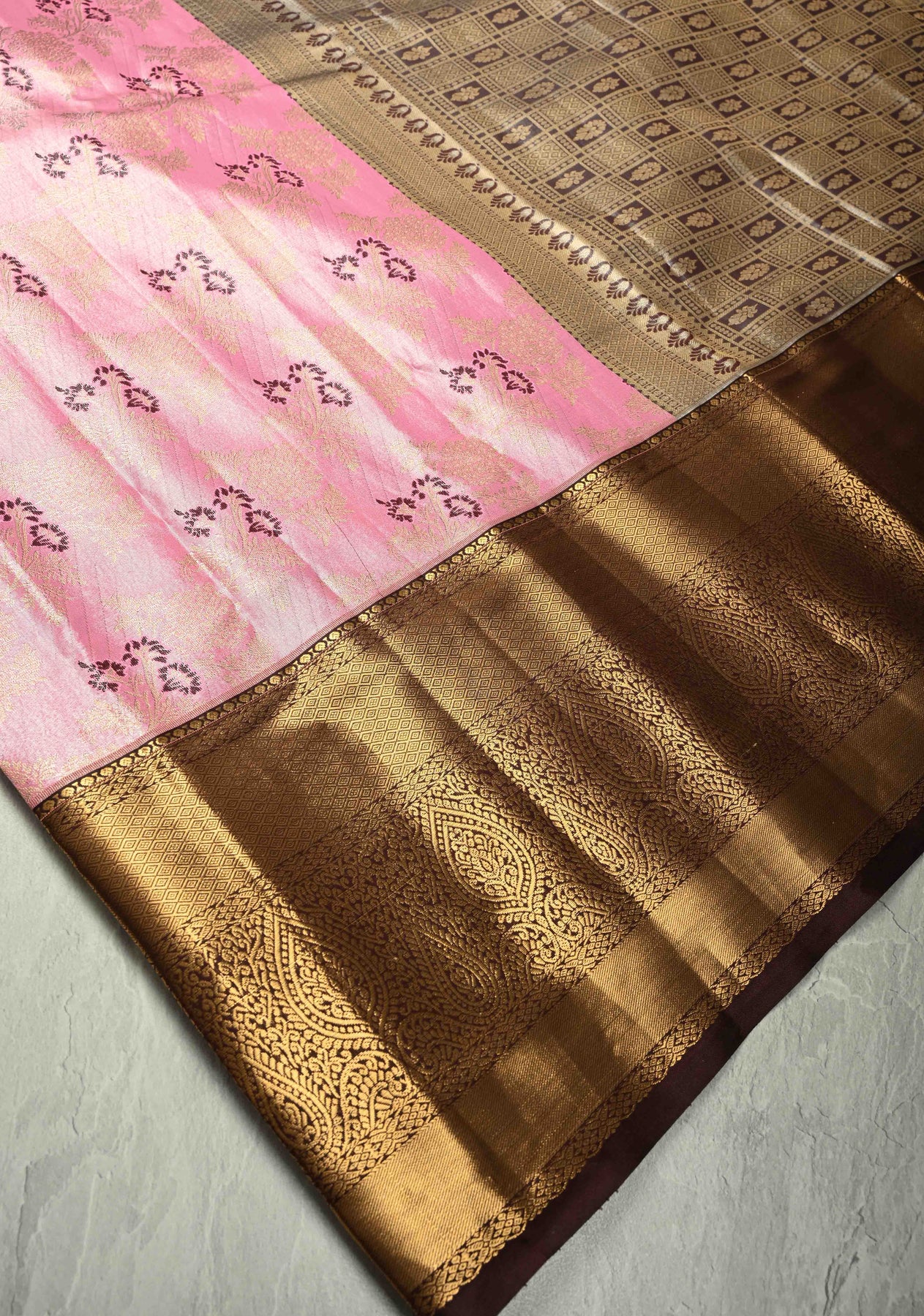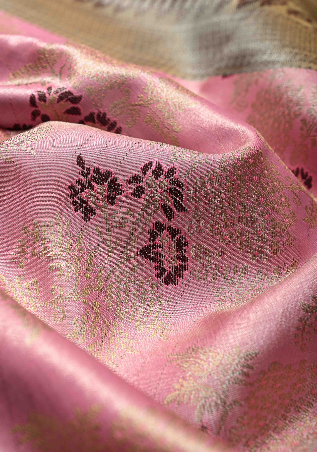 The saree features an intricate Meenakari floral brocade jaal, showcasing timeless artistry in every motif. A contrast wide zari border adds a regal touch, enhancing the saree’s luxurious appeal while providing a striking frame to the soft pink fabric.