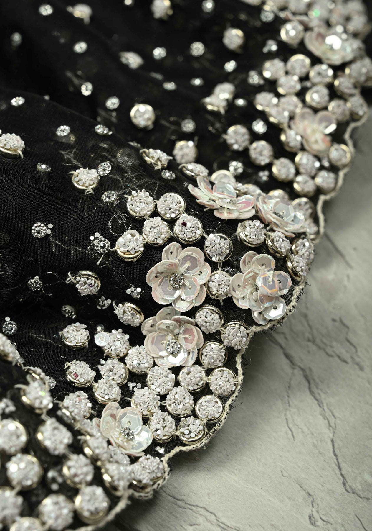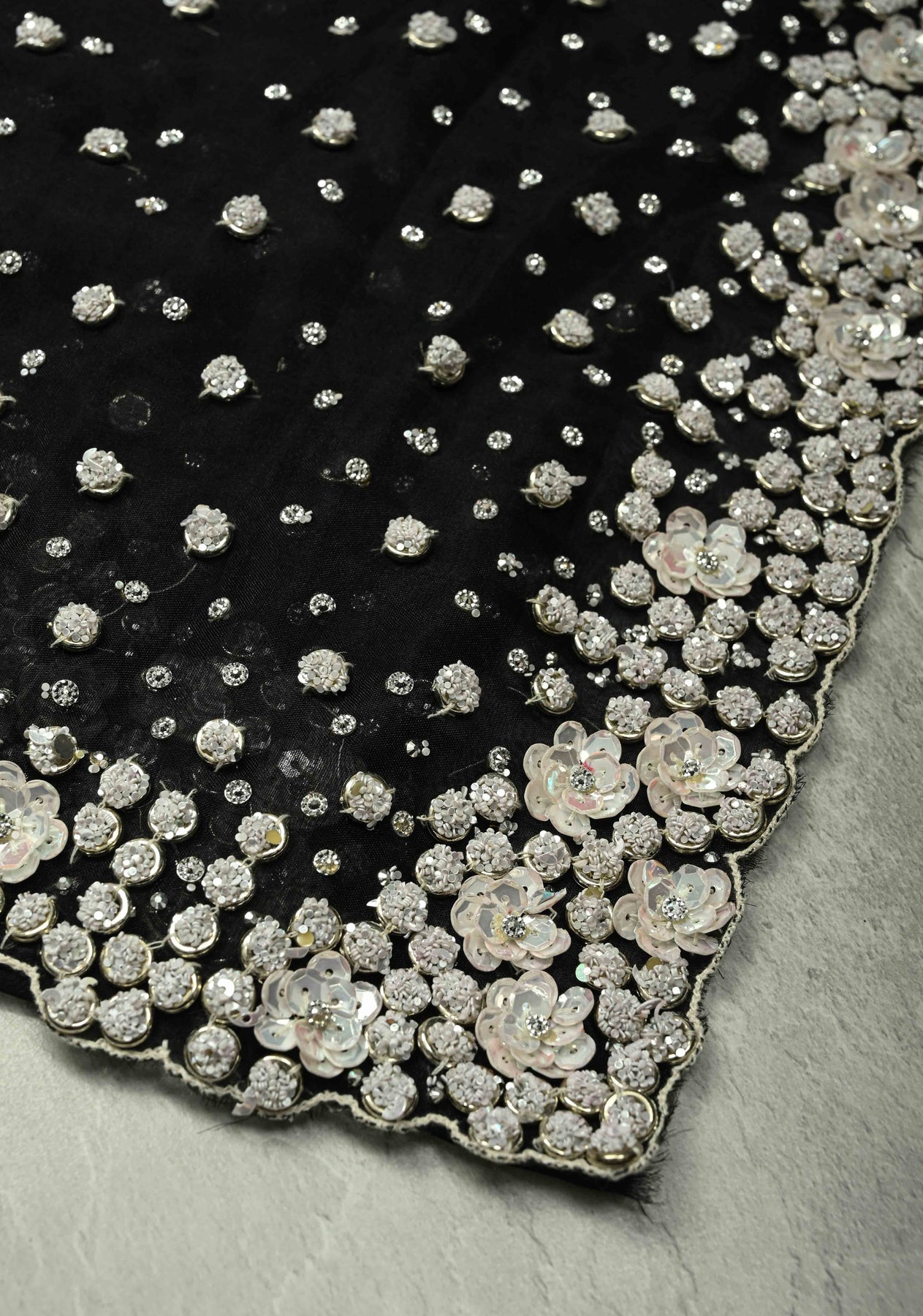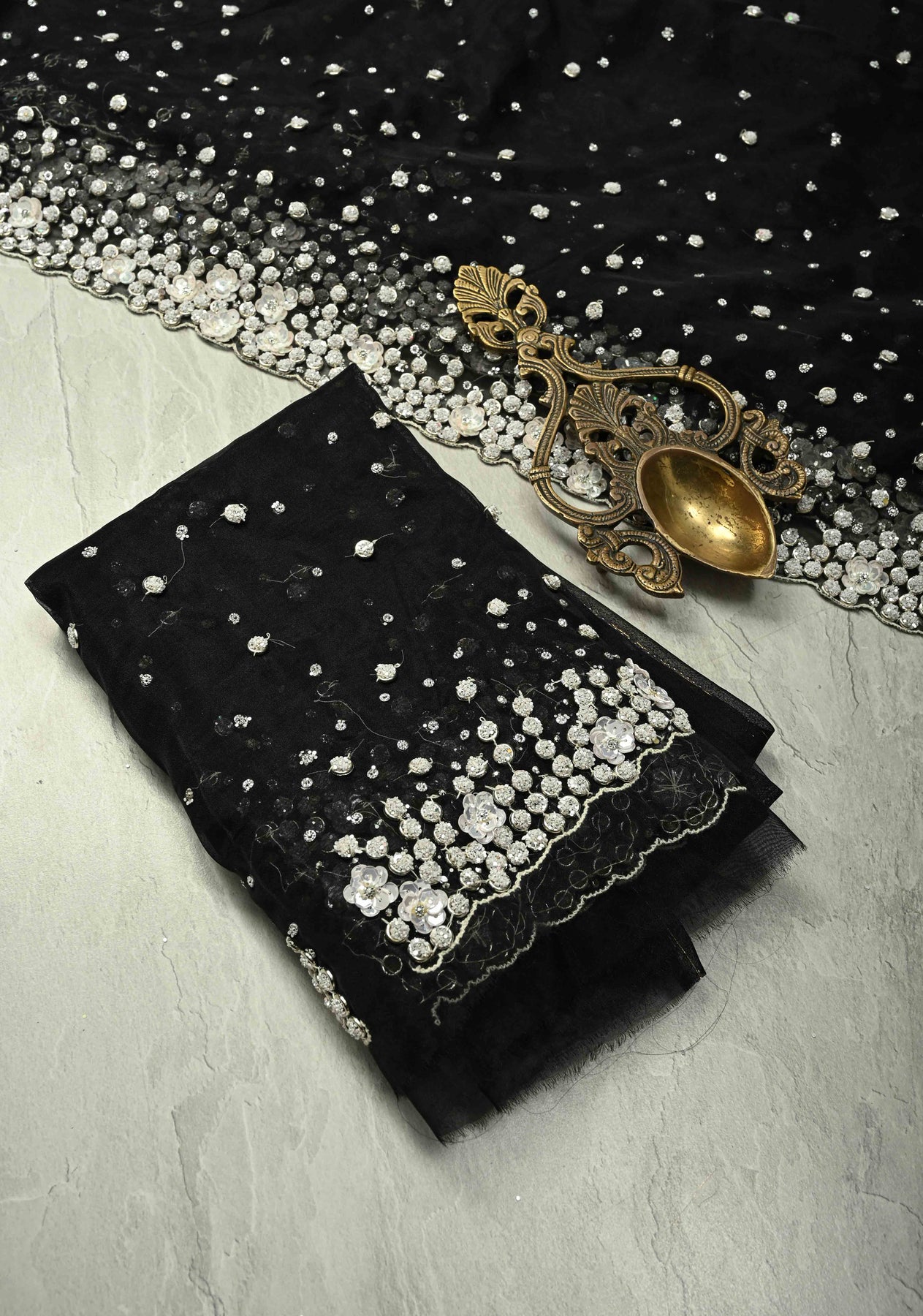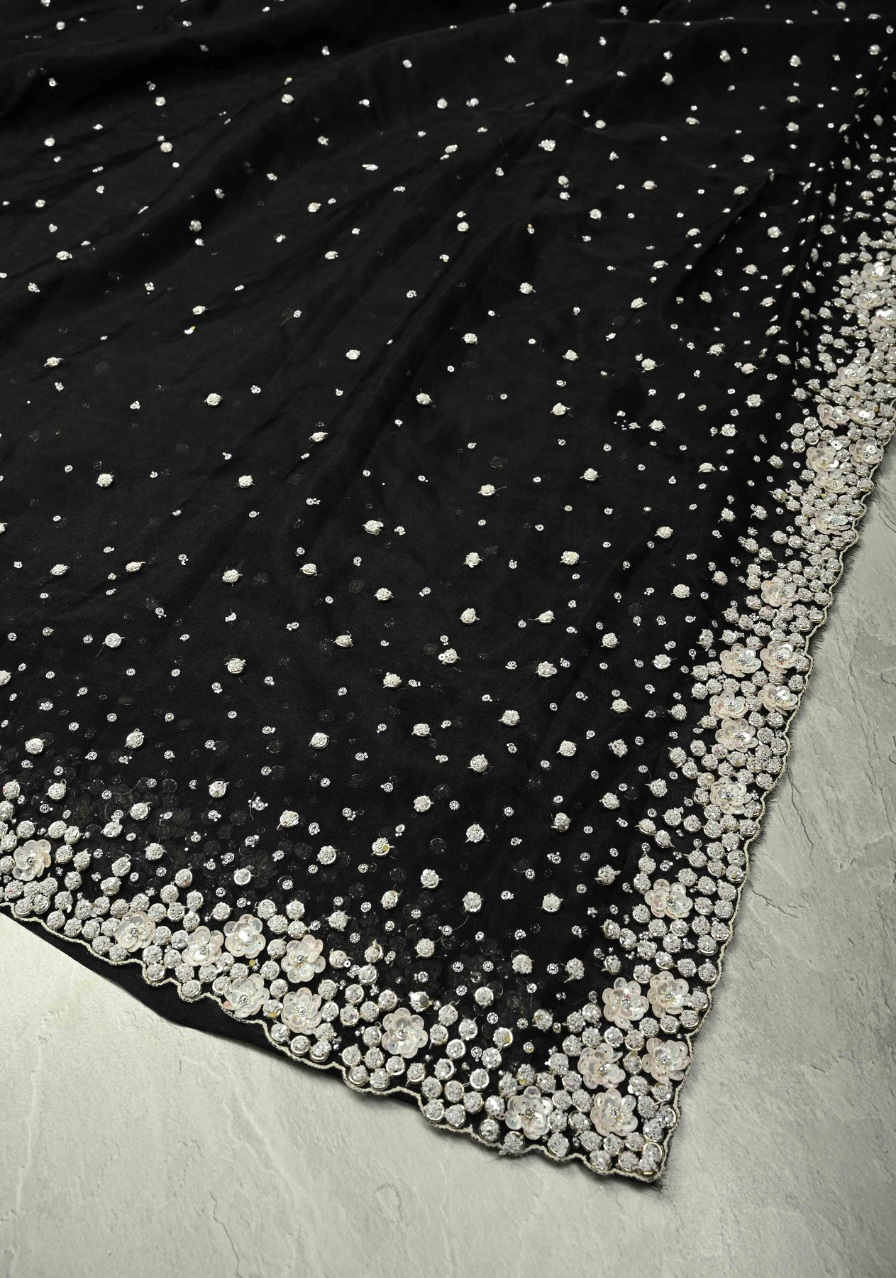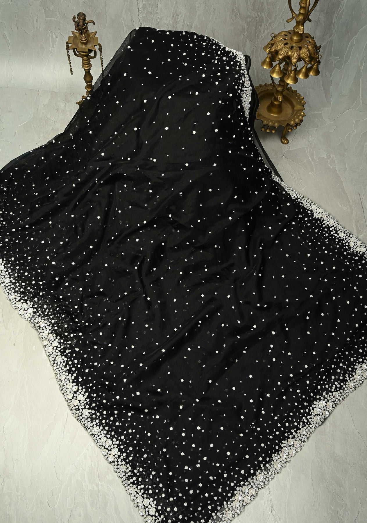 The contemporary scallop border adds a unique, stylish finish, elevating the saree from traditional to modern-chic. Flowing gracefully and lightweight, it drapes effortlessly, making it ideal for weddings, cocktail parties, evening soirées, or festive celebrations. A perfect choice for women who love to combine artistry with a contemporary edge.