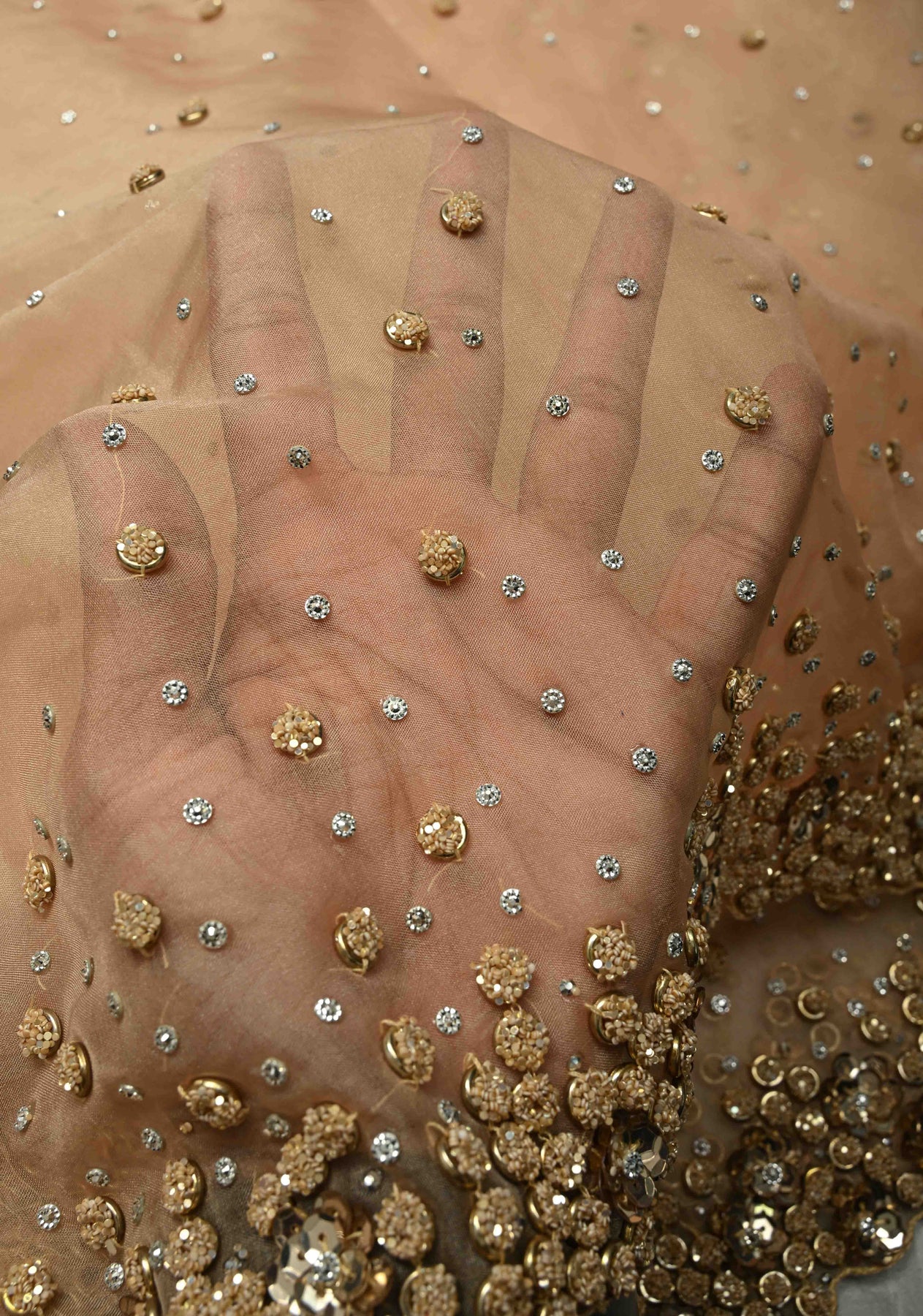 This exquisite organza saree showcases a sophisticated chiku color palette, offering a soft, elegant appeal perfect for both formal occasions and festive celebrations. The saree is beautifully adorned with intricate handwork, featuring delicate stone and sequin embellishments that add a subtle shimmer and luxurious texture throughout the fabric. Enhancing its contemporary charm is a finely crafted scallop border, designed to lend a modern yet graceful touch to the traditional silhouette. Lightweight and ethereal, this saree effortlessly combines timeless artistry with a modern aesthetic, making it a standout piece in any wardrobe.
