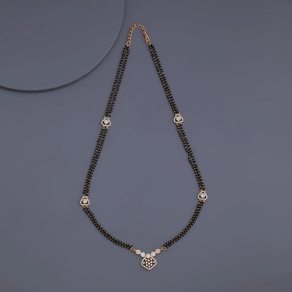 Make a chic style statement with this contemporary two-strand mangalsutra, featuring a sleek geometric zircon pendant paired with classic black beads. Crafted by Artisans of Kushal's The minimalist design blends modern aesthetics with traditional significance, offering a perfect accessory for today’s woman. Ideal for work, casual outings, or festive events, this mangalsutra adds a refined touch to any look.