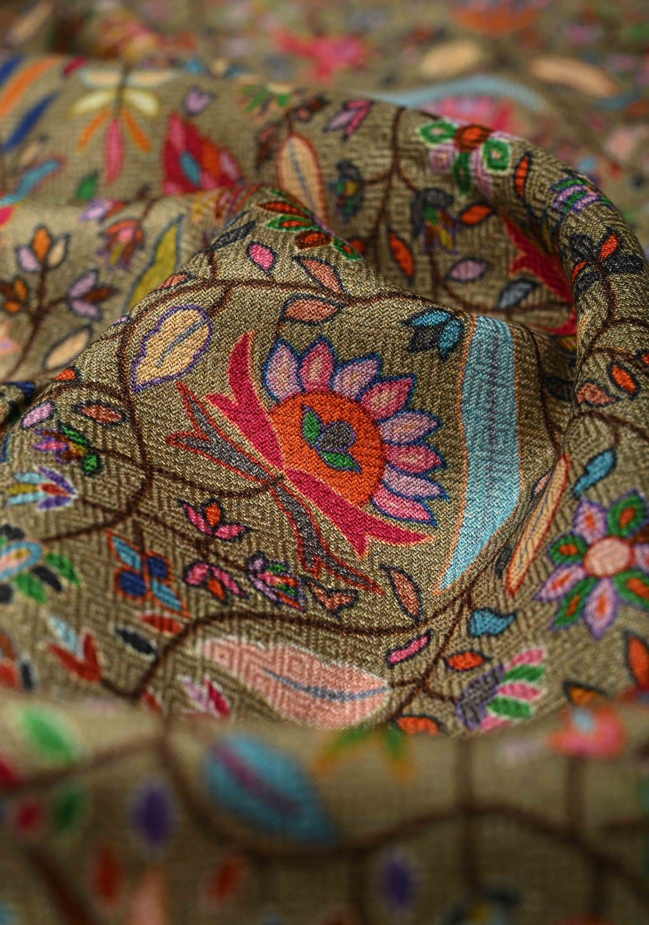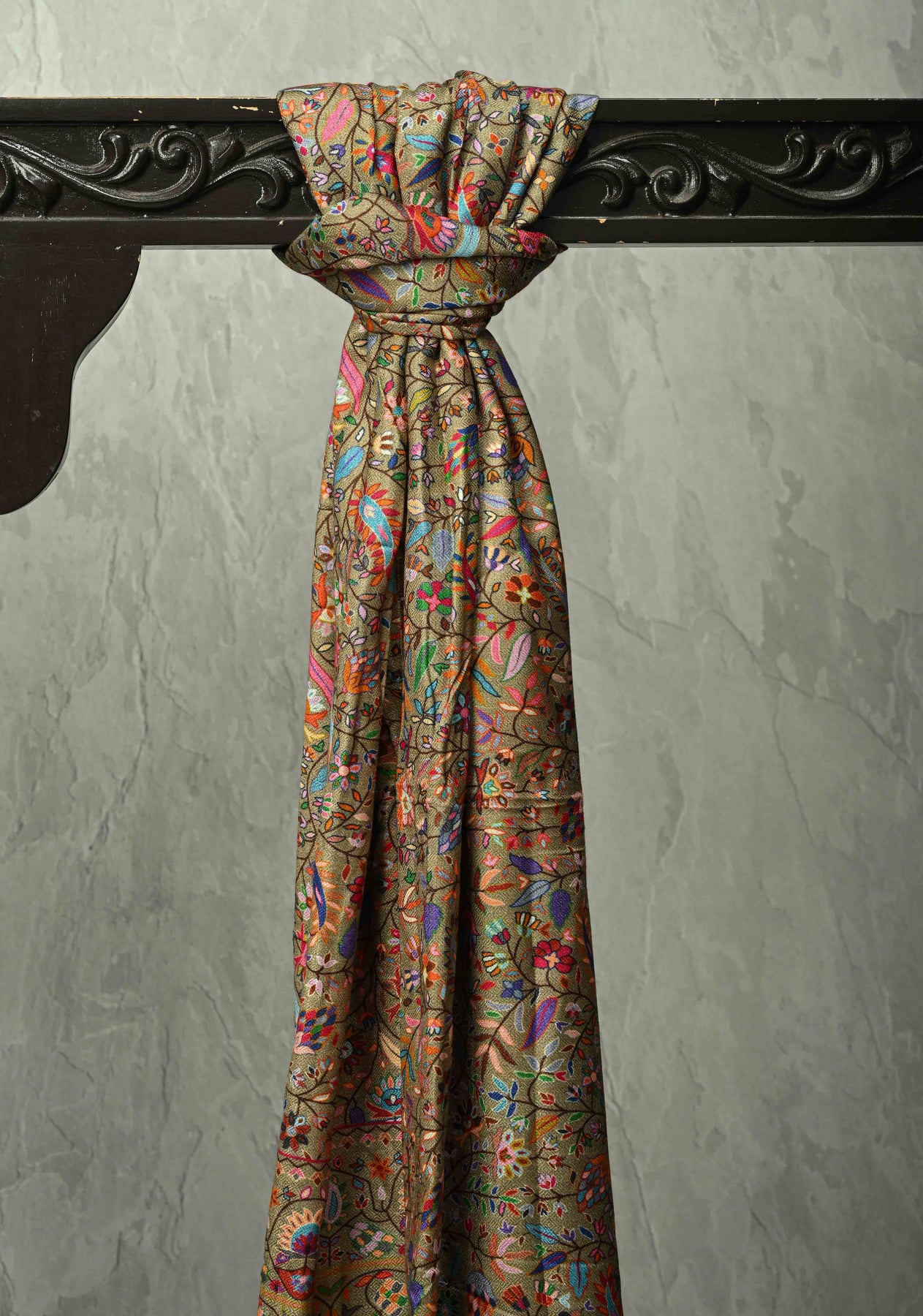 The Dark Sage Green Floral Meenakari Jaal Brocade on Cashmere Shawl is a luxurious accessory that beautifully combines elegance and traditional craftsmanship. Made from cashmere, it offers a soft, lightweight, and cozy feel, perfect for draping in style. The deep dark sage green base is adorned with intricate Meenakari floral jaal brocade, featuring delicate multicolored motifs that showcase exquisite artistry. Ideal for weddings, festive events, or formal gatherings, this shawl adds a regal touch to both traditional and contemporary attire. Its refined design and fine craftsmanship make it a timeless addition to any wardrobe.