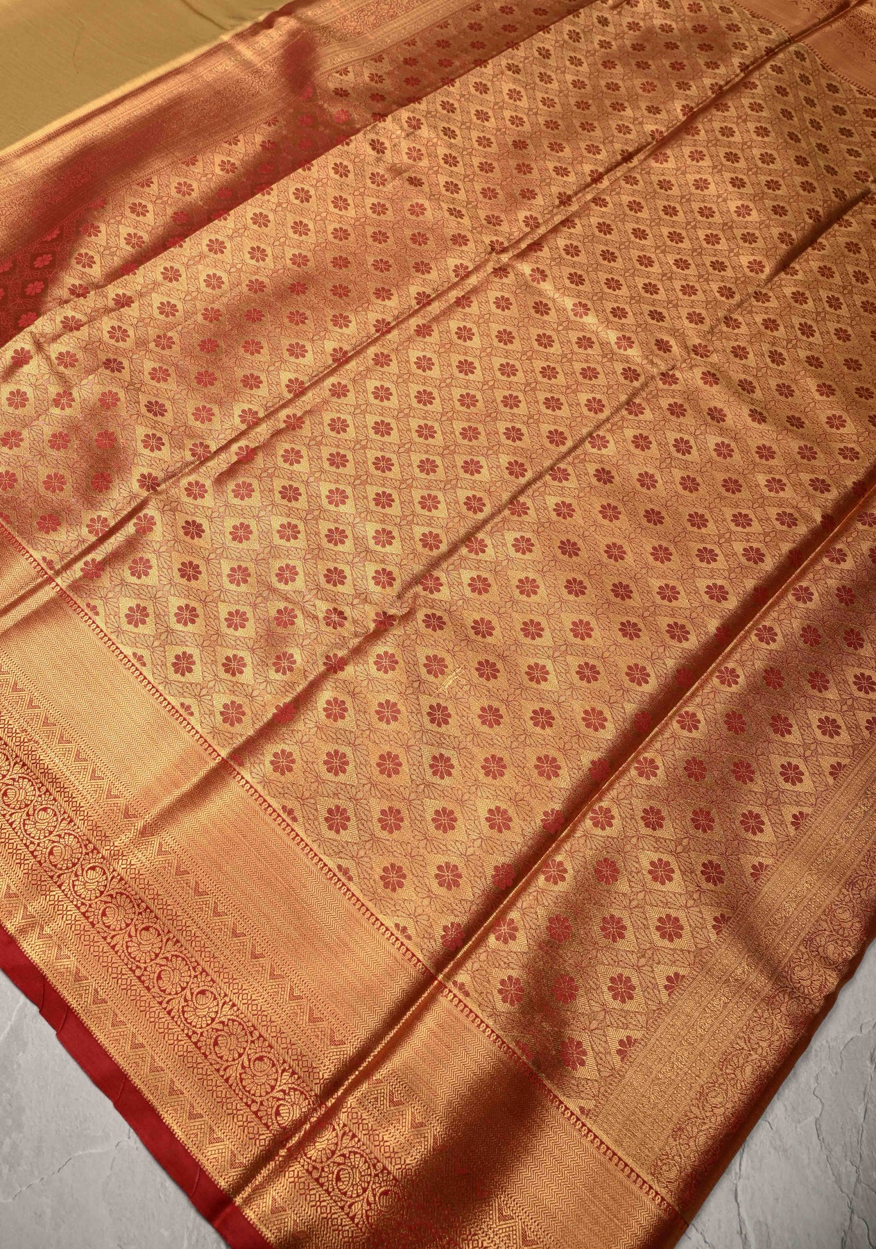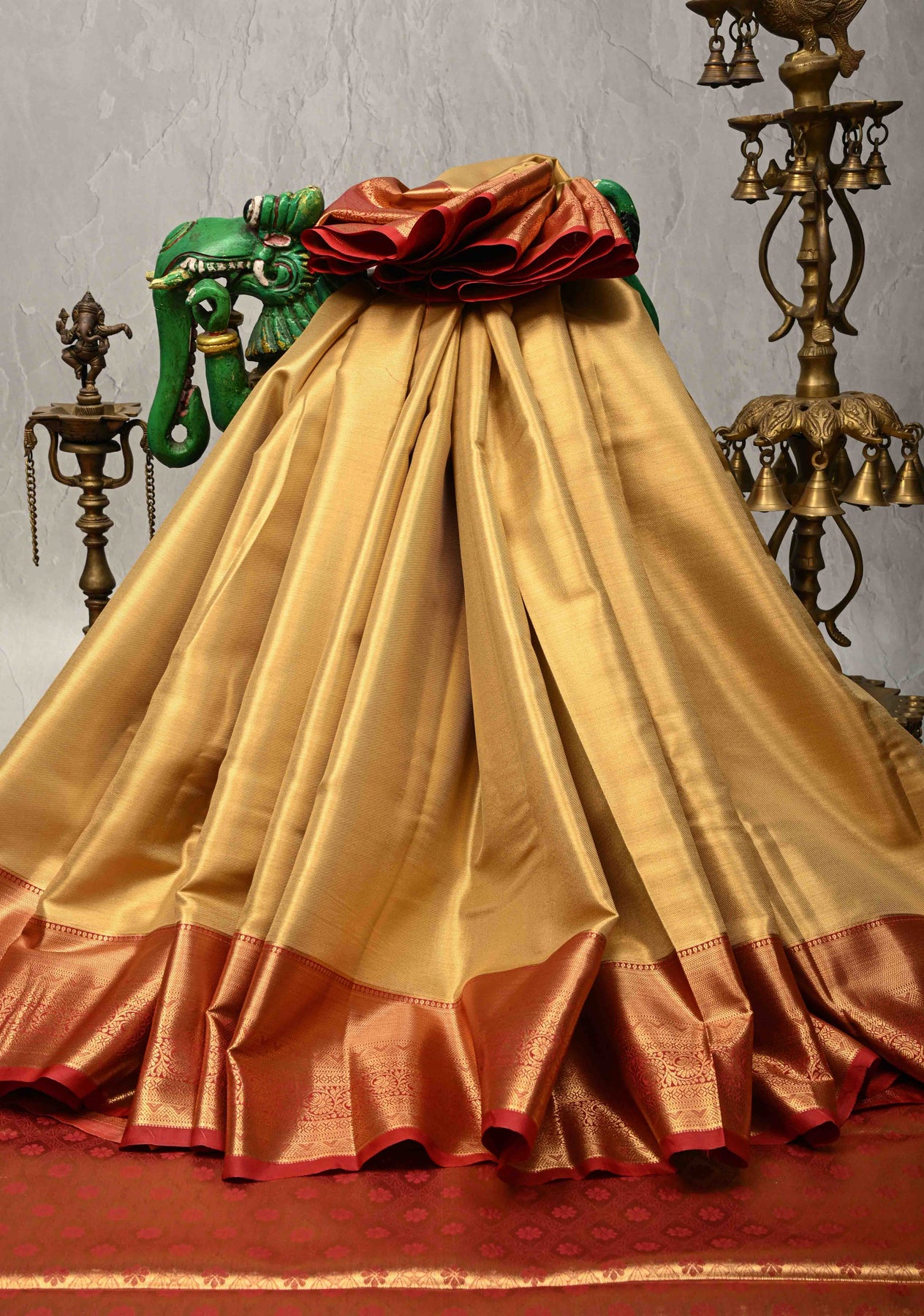 Radiate regal charm in our Gold Kanchi Tissue Semi Silk Saree, a stunning expression of traditional artistry and timeless elegance. Woven from lustrous semi silk with a delicate tissue finish, this saree glows with a rich golden hue that enhances its luxurious appeal. The highlight is the bold Contrast Zari Border, which adds a striking visual edge and beautifully frames the saree. Ideal for weddings, festive celebrations, and cultural gatherings, this saree pairs effortlessly with traditional jewelry and a contrasting blouse to create a sophisticated, head-turning look.