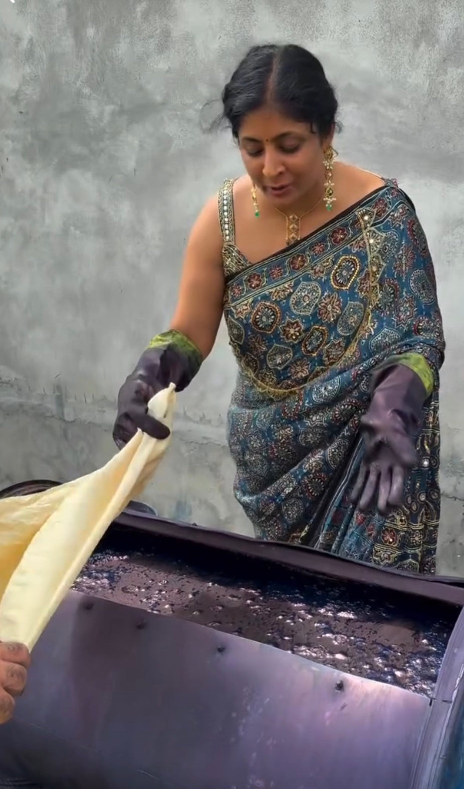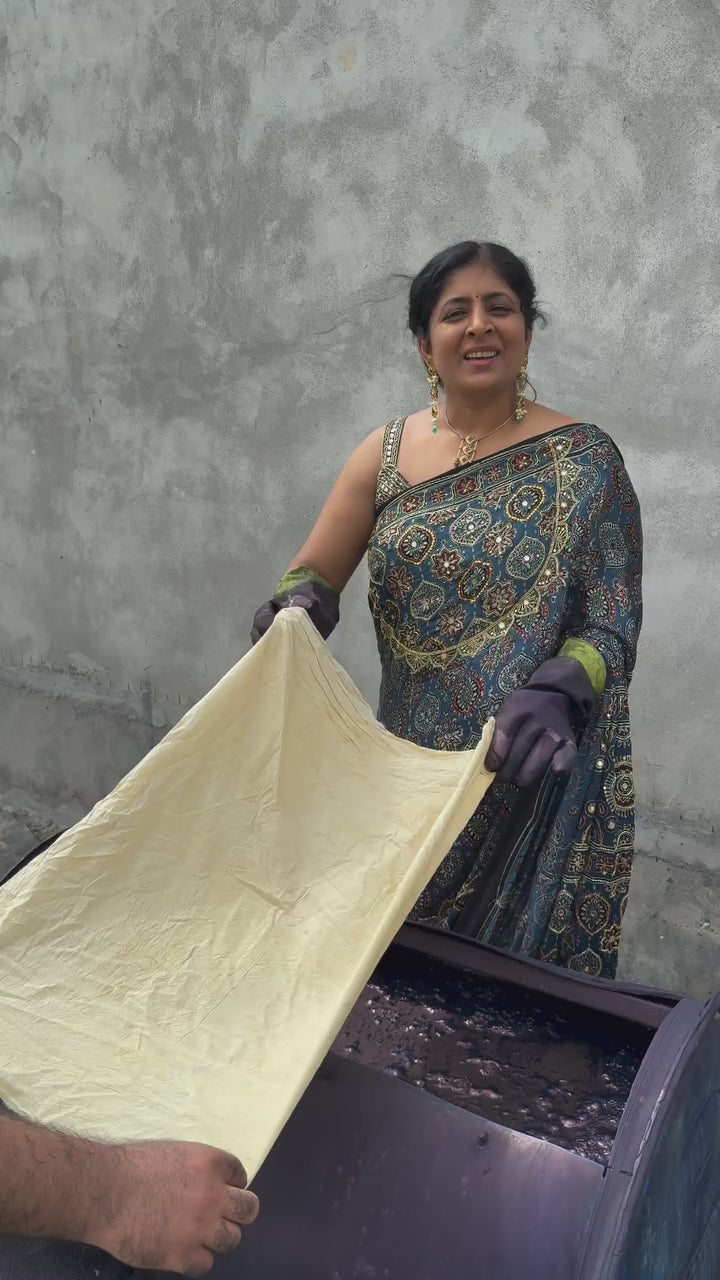 Made from Modal Silk, the fabric is known for its soft, breathable texture and natural sheen. It drapes beautifully and feels luxuriously smooth against the skin, making it ideal for festive and special occasions. Originating from Kutch, Gujarat, Ajrakh is a centuries-old resist-dyeing technique using natural dyes and hand-carved wooden blocks. The designs are often symmetrical, featuring geometric, floral, and star motifs.