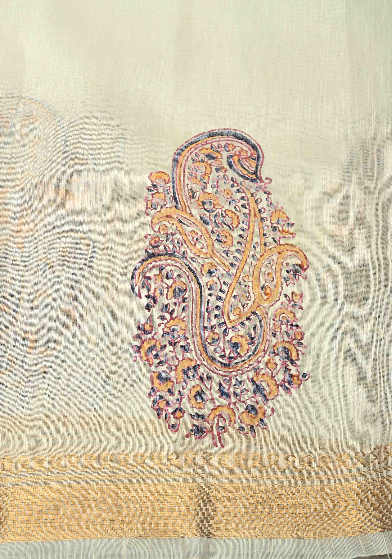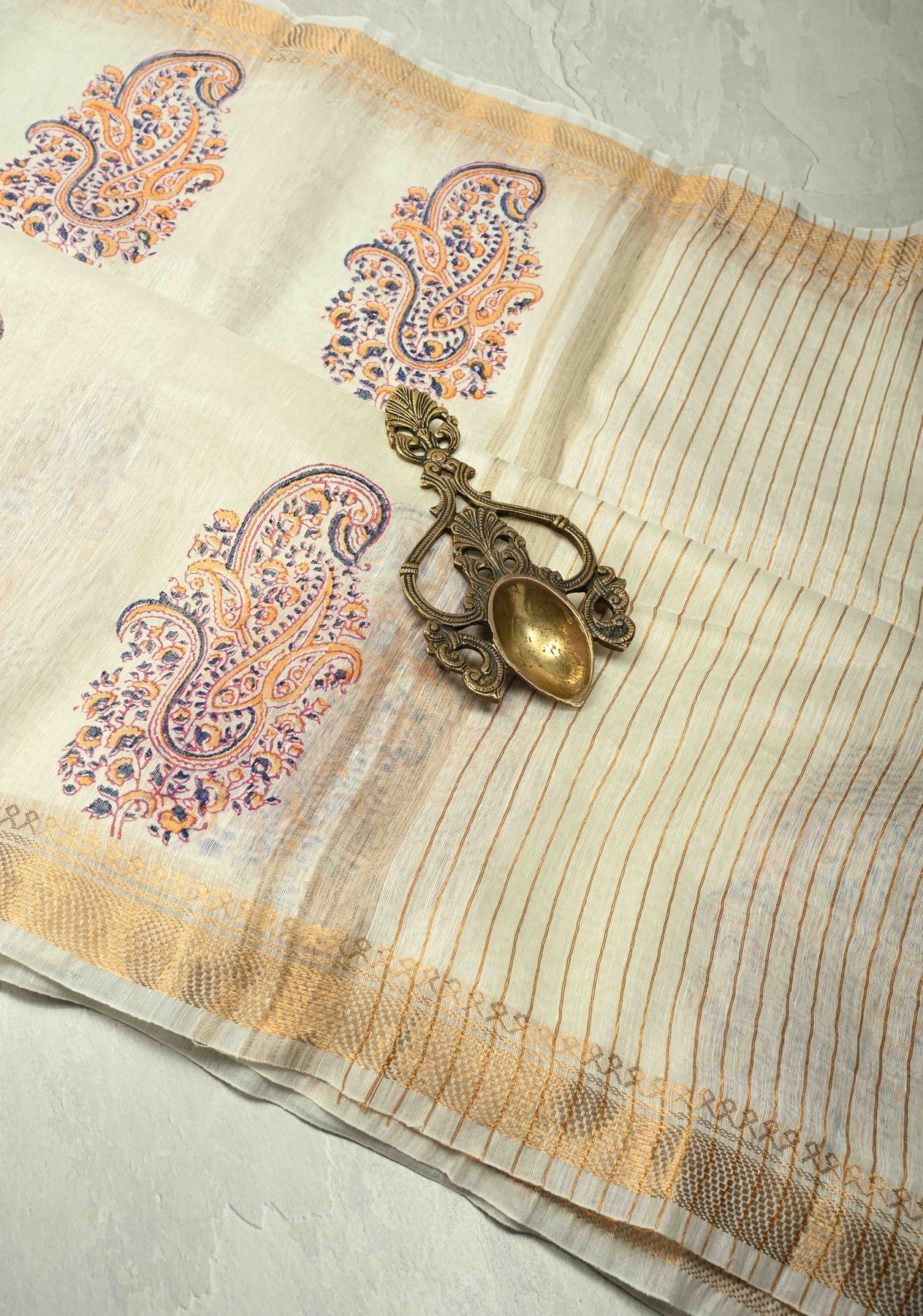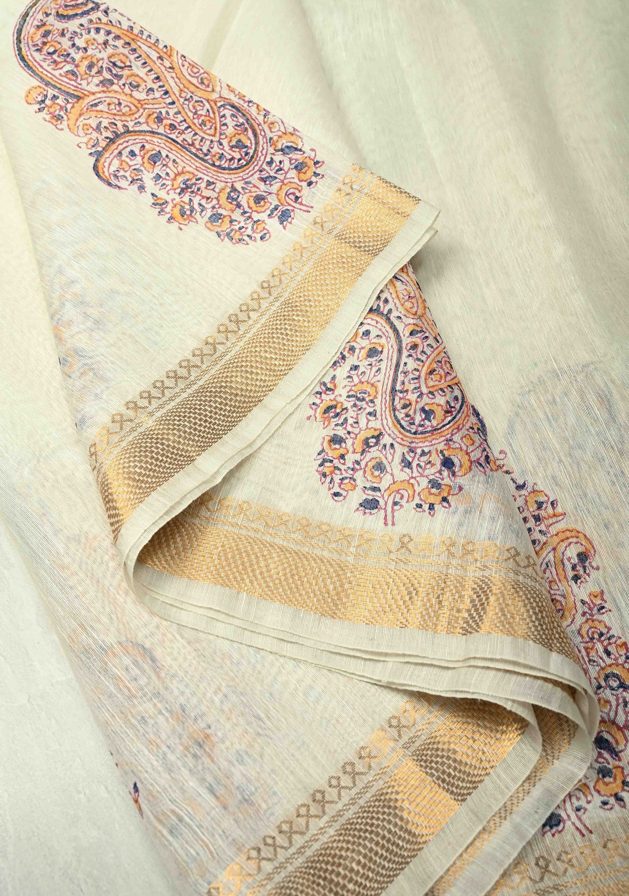 Off White Silk Linen Saree with Paisley Handblock Block Print Motifs and Zari Borders