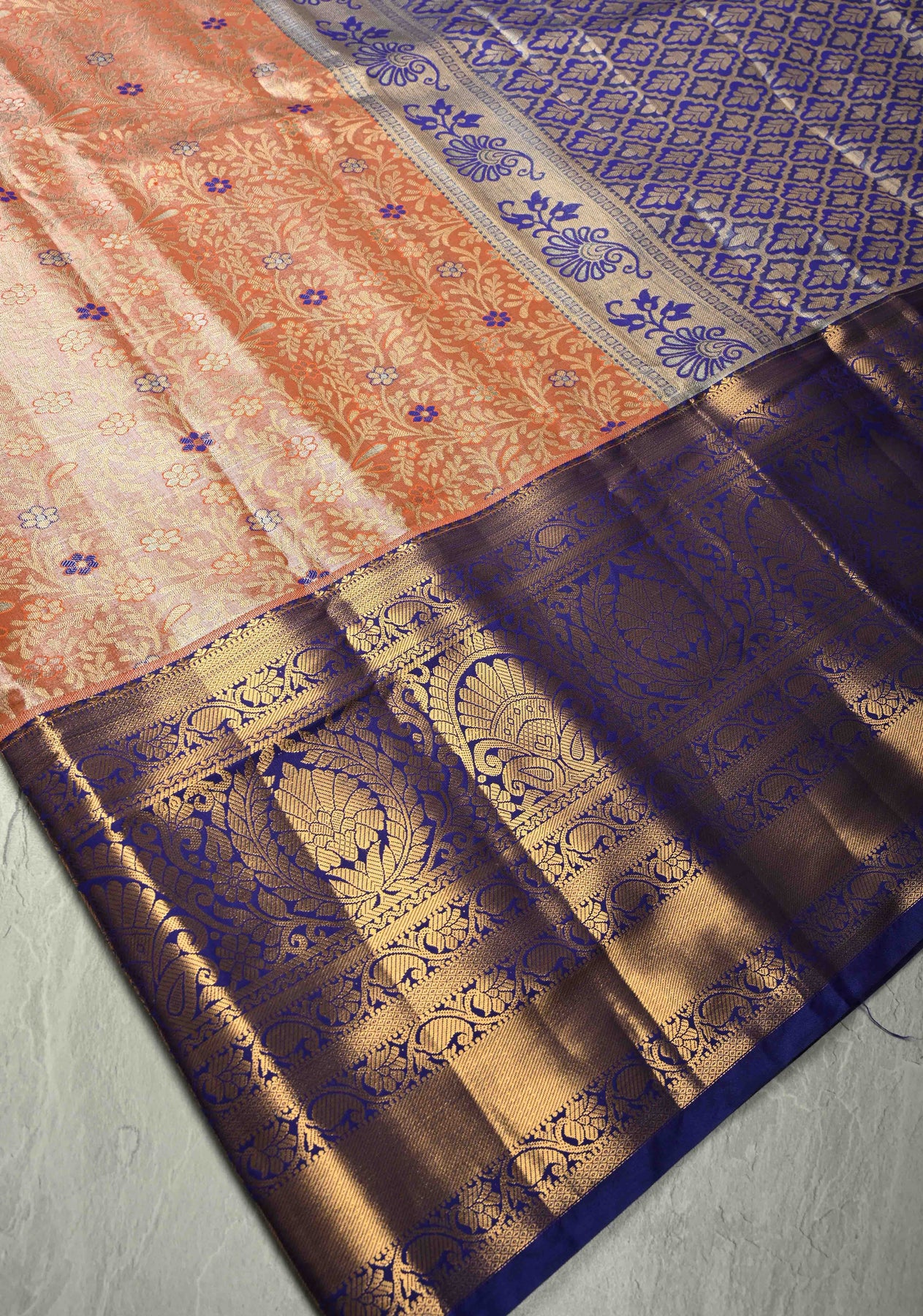 This Orange Kanjivaram Tissue Semi-Silk Saree is a radiant expression of traditional artistry and refined elegance. Crafted with a shimmering tissue weave, the saree exudes a rich, golden-orange glow that beautifully catches the light with every movement. The intricate Meenakari floral brocade jaal adorns the body, showcasing detailed patterns that reflect the grandeur of Kanjivaram craftsmanship. Complementing its vibrant hue, the contrast wide zari border in gold adds a majestic finish, enhancing its festive allure. Perfect for weddings, celebrations, and special occasions, this saree embodies timeless sophistication and opulent charm—making it a statement piece in any ethnic wardrobe.