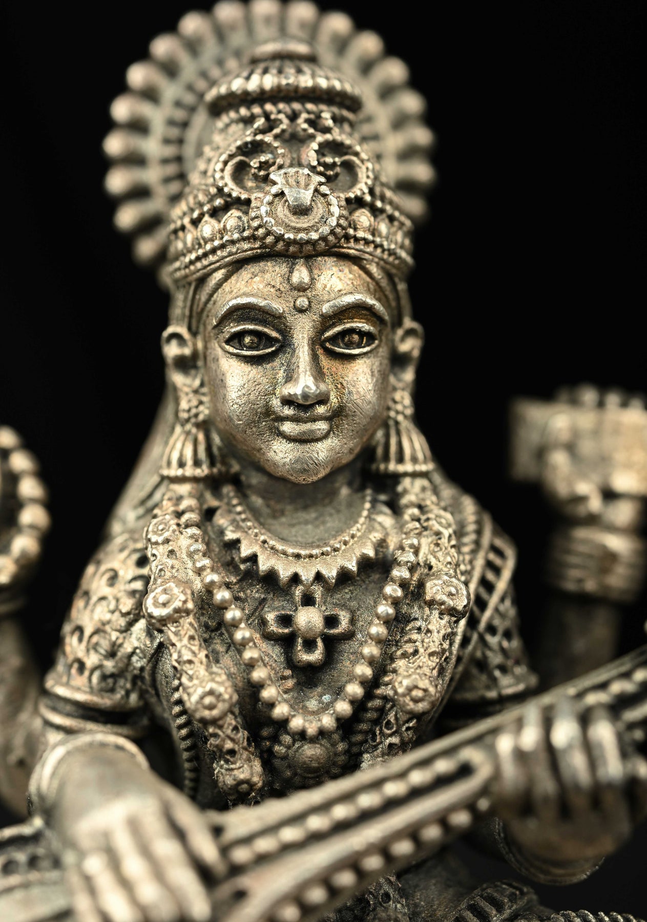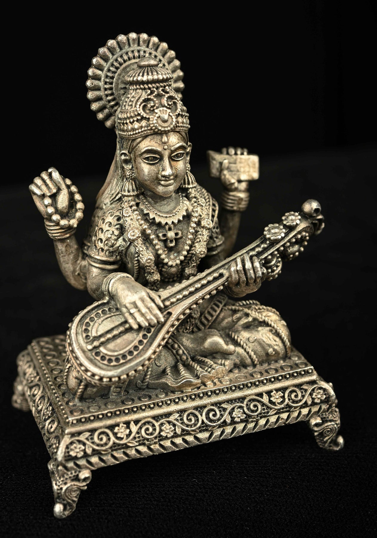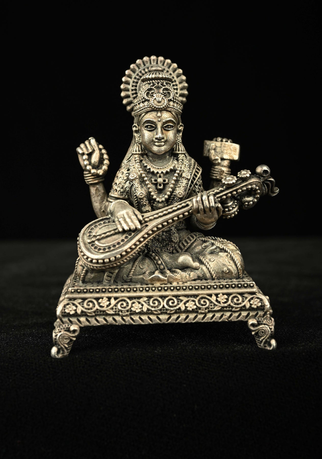 This Pure 92.5 Silver Oxidized Goddess Saraswati Idol is a beautifully crafted representation of the goddess of knowledge, music, and wisdom. Made from silver with an oxidized finish, the idol highlights intricate detailing that brings out the divine features and traditional symbolism of Goddess Saraswati. The oxidized texture gives it a vintage, timeless appeal, making it a perfect piece for your home altar, office, or as a meaningful gift. Lightweight yet durable, this idol embodies spirituality and artistry, inspiring peace and learning wherever it is placed.